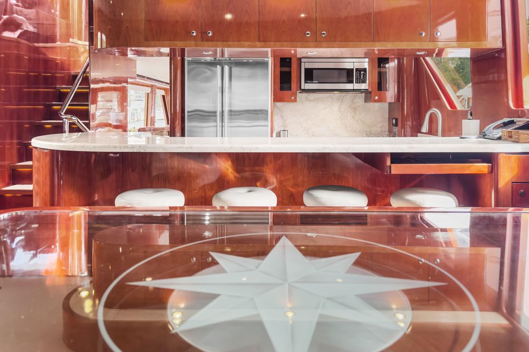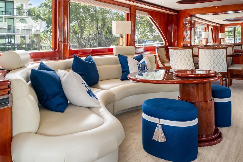 This yacht boasts a spacious main salon and dining area, remarkable for her size class. The custom cherry woodwork, a $500,000 upgrade, remains in impeccable condition, radiating timeless elegance. A significant interior refit by Yacht Interiors by Shelley enhanced her with all-new soft goods, carpeting, galley appliances, and granite countertops. During this upgrade, key systems were modernized, including a new toilet system, updated navigation equipment, compressors, air handlers, larger TVs, electric blinds, and surround sound, ensuring a luxurious onboard experience.