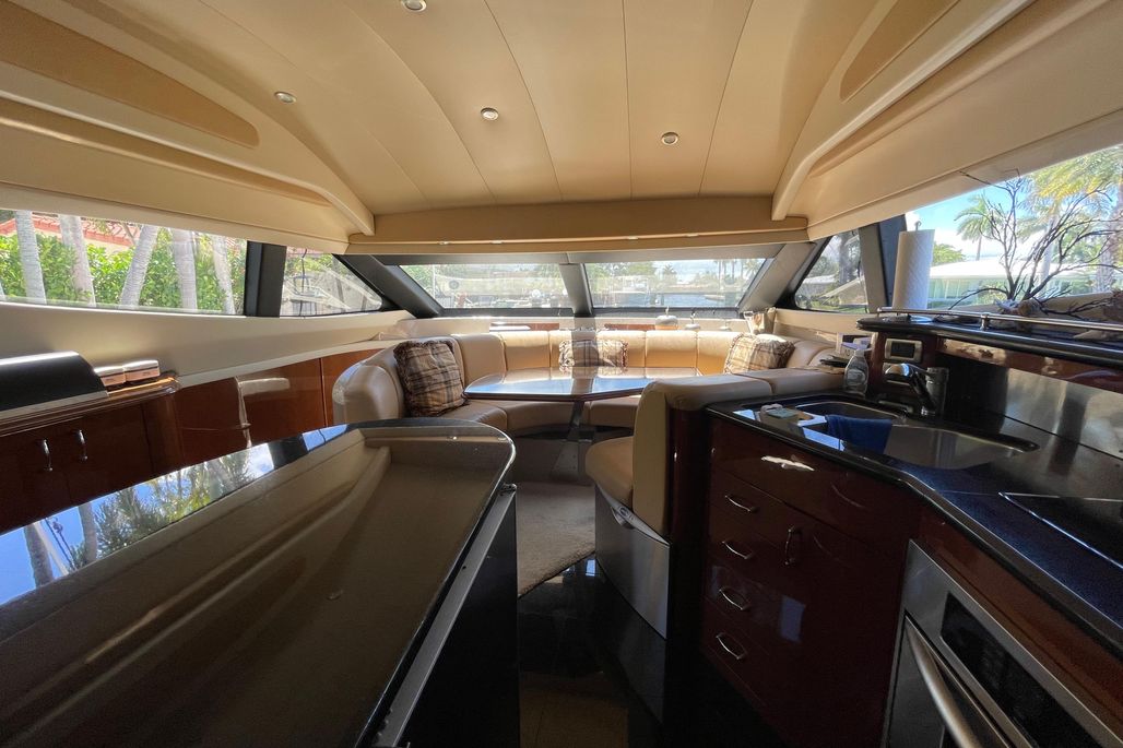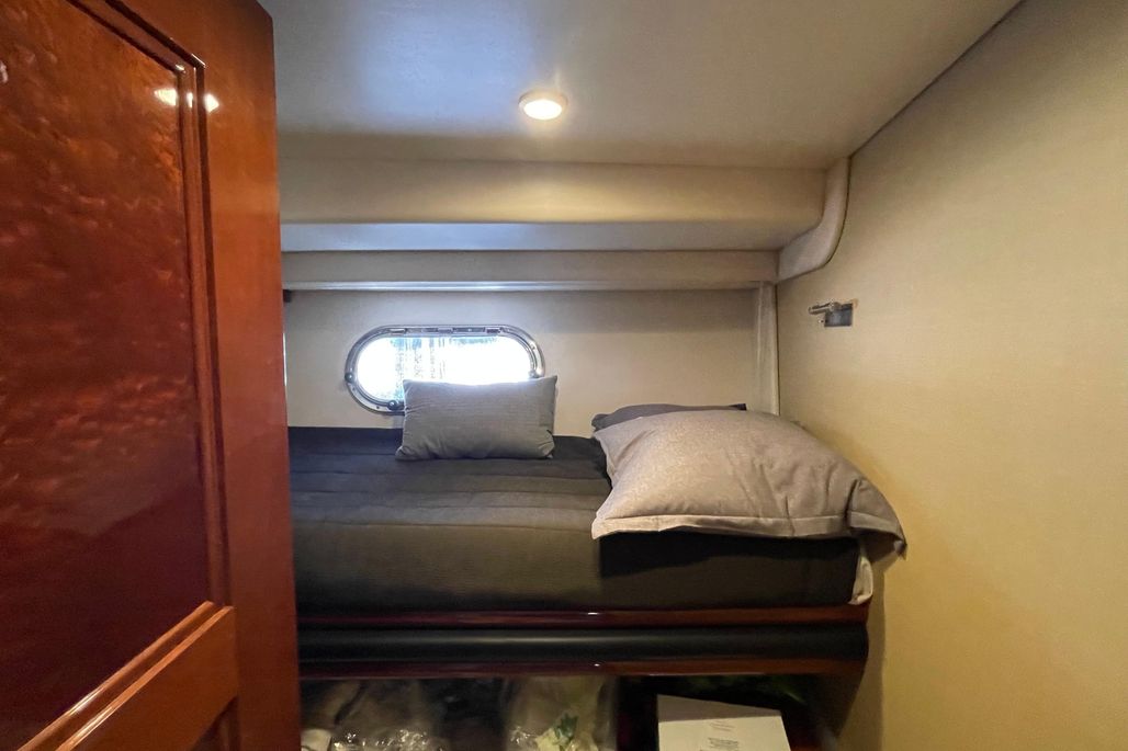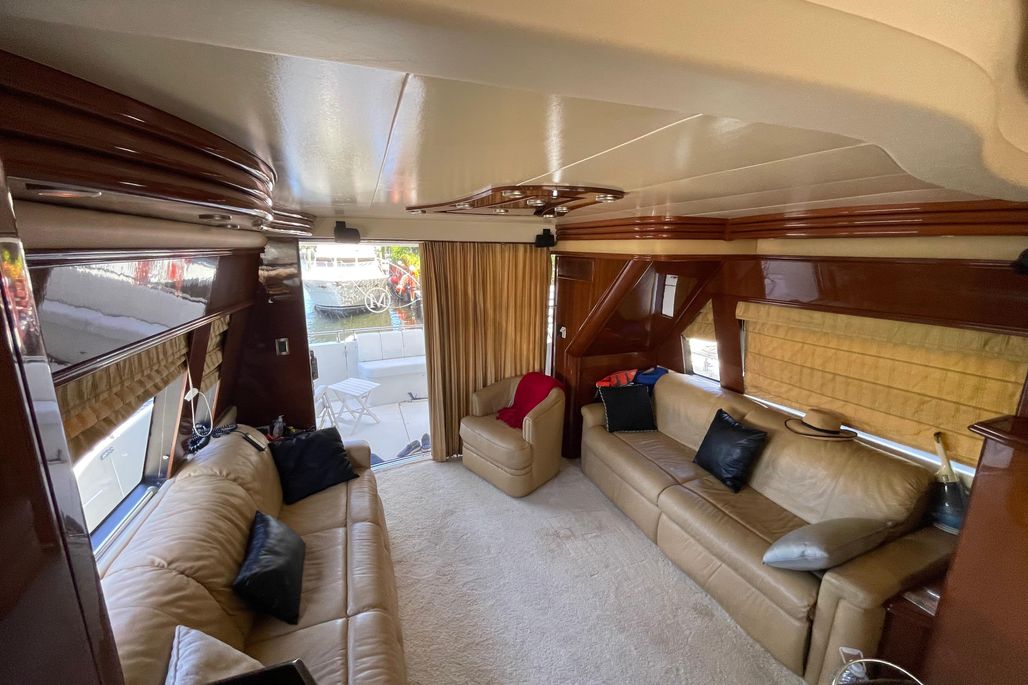 On deck, the flybridge provides expansive seating, a helm station with excellent visibility, and plenty of space for entertaining. The aft deck flows seamlessly into the salon, where large windows and an open floorplan create a bright, inviting interior. Below, you’ll find a well-appointed galley, generous salon seating, and comfortable staterooms ideal for extended cruising or weekends aboard.