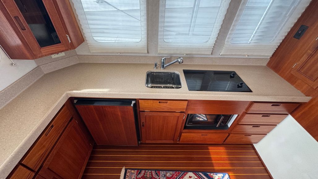 Moving into the salon, the open layout maximizes space and natural light. The large settee converts into an oversized double berth for guests. The galley is efficiently arranged, and the stove was replaced in 2022. In 2024, the teak sole was professionally stripped and refinished, elevating the warmth and classic character of the interior. In 2025, carpeting on the stairs to the stateroom was removed and replaced with elegant sapele wood steps—another thoughtful aesthetic upgrade.
