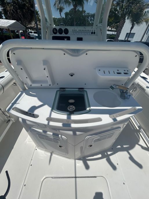 Comfort features include a marine toilet inside the console, a freshwater sink, and third-row transom seating, giving you more space for guests or crew. A windlass anchor system makes anchoring effortless at reefs or sandbars.