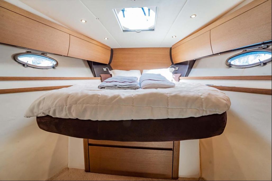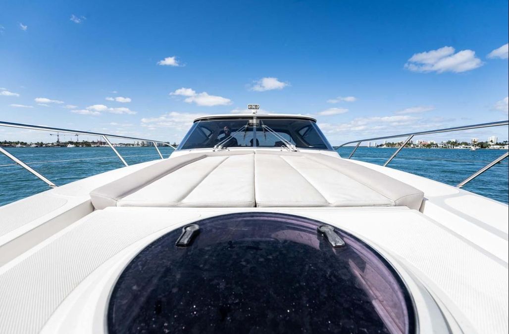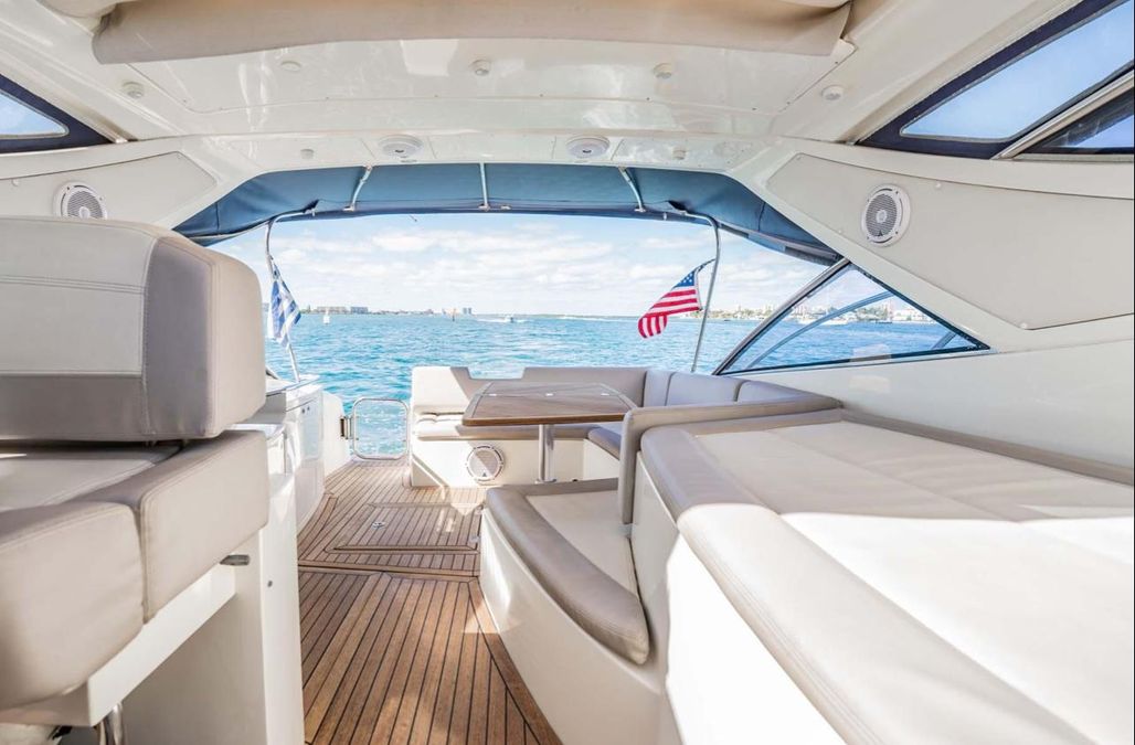 The 40 Atlantis features a generous swim platform leading to an enormous helm deck area great for entertaining. The port side features a U-Shaped dinette followed by a lounger forward. To starboard, is your wet bar with a sink, refrigerator, ice maker, cockpit grill and storage, forward is the helm with a double wide captain’s chair. The helm deck also features a teak sole throughout, Fusion stereo system, and a retractable sunroof.