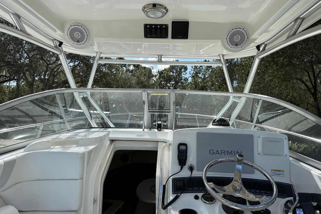 Fish through the day and relax through the night on a boat that is beautifully appointed for both. You'll appreciate the combination of low maintenance, practicality and comfort of the 285 Conquest. In the over-sized cockpit, there's a folding stern seat, adjustable helm seat and portside lounge. For fishing, there's a lighted livewell, rod holders and two insulated in-deck fishboxes with pump-outs. The wide beam provides roominess for up to 14 people. The carefully designed cabin has a galley area and enclosed head with room to spare. Four can overnight comfortably in the forward V-berth / dinette and mid-cabin double berth. You'll find tons of storage for gear, rods, beverages and the catch of the day.
