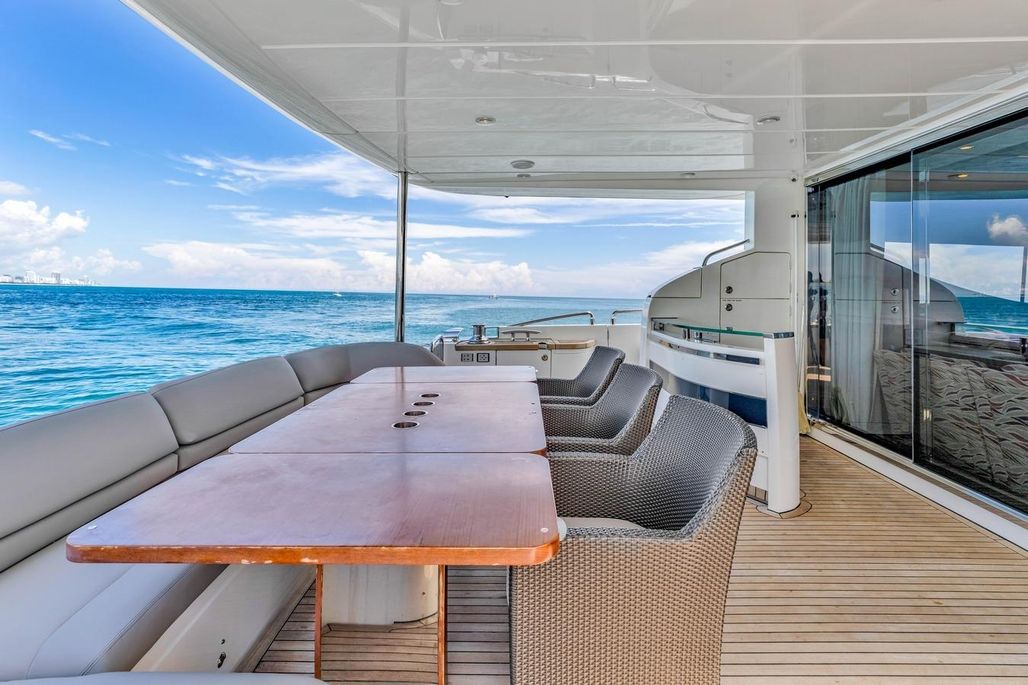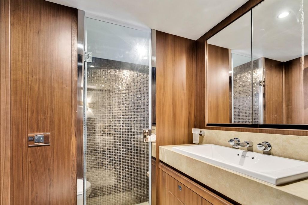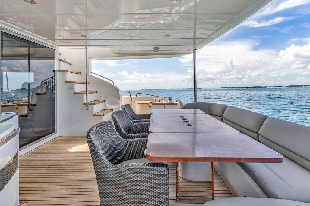 Her exterior spaces are designed for enjoyable time on the water. The flybridge offers ample seating, sunbathing areas, and a hot tub, making it a comfortable space for relaxing and socializing. A hydraulic swim platform provides easy access to the sea, while the davit on the flybridge allows for convenient handling of tenders or toys. With her shallow draft, the yacht can access a variety of cruising destinations, including those with limited depths.