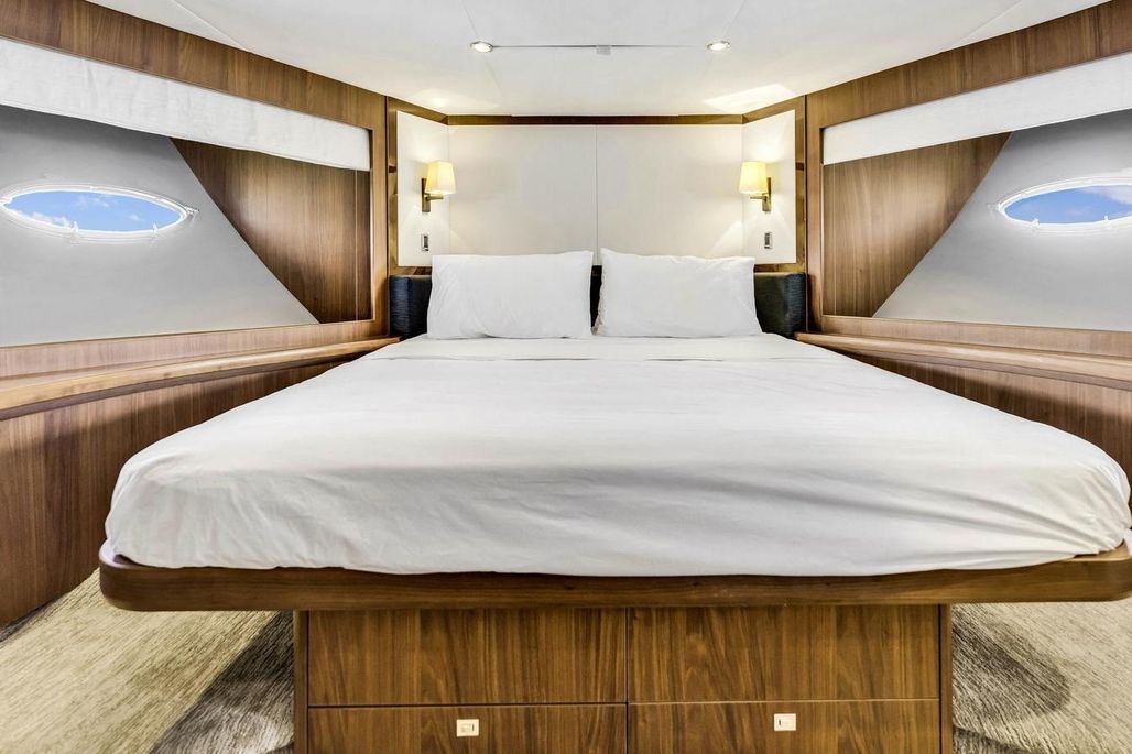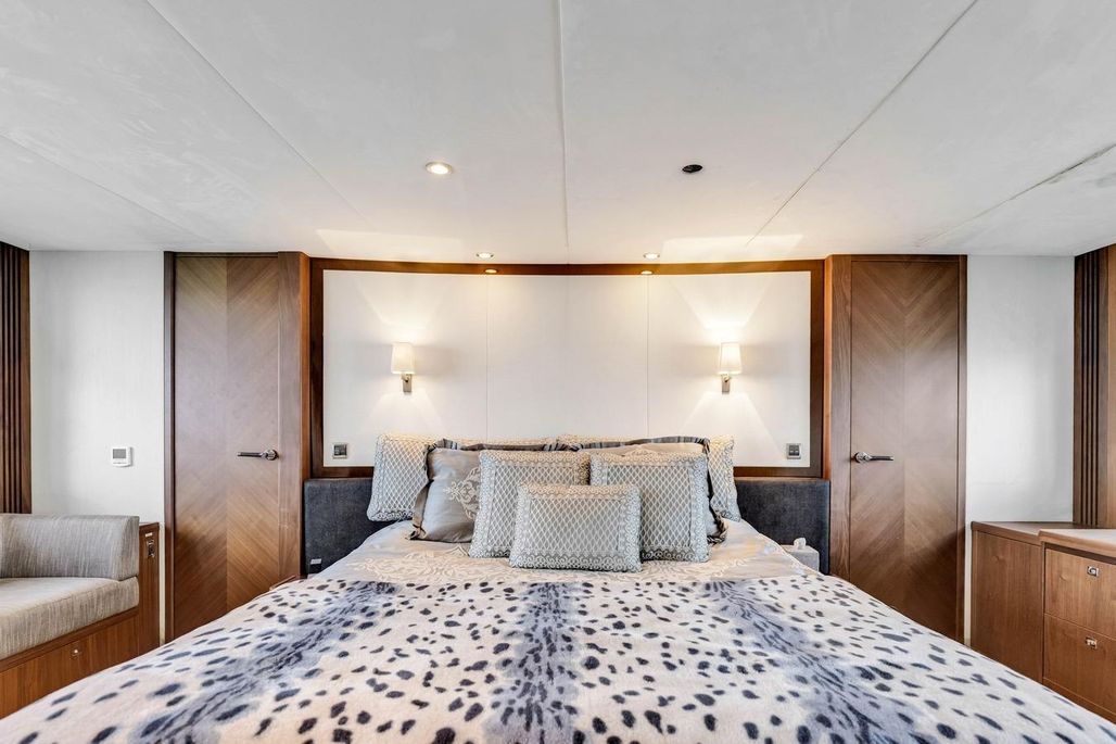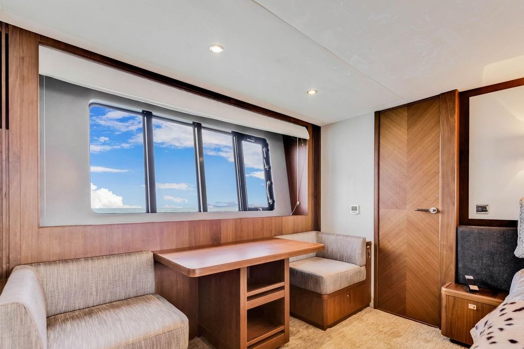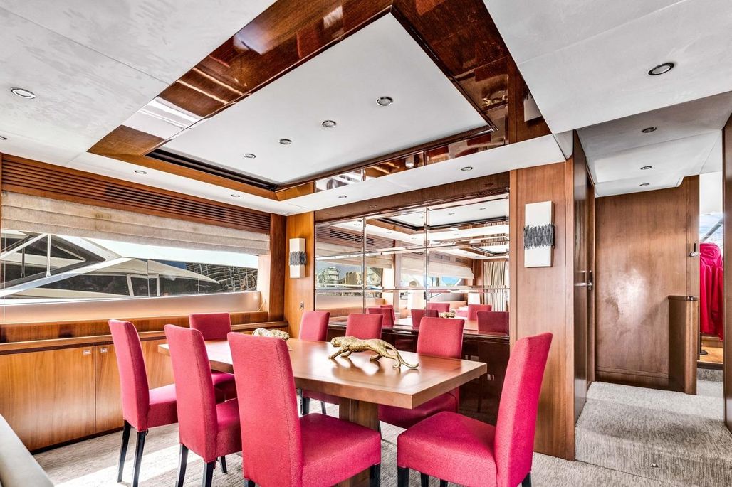 The yacht accommodates eight guests in four cabins, including a full-beam master suite, a forward VIP cabin, and two twin guest cabins, all with en-suite bathrooms. The interior benefits from large windows that bring in natural light, giving the salon and dining area an open and welcoming feel. The layout is designed to maximize comfort and functionality, with a versatile arrangement that works equally well for family use or charter.