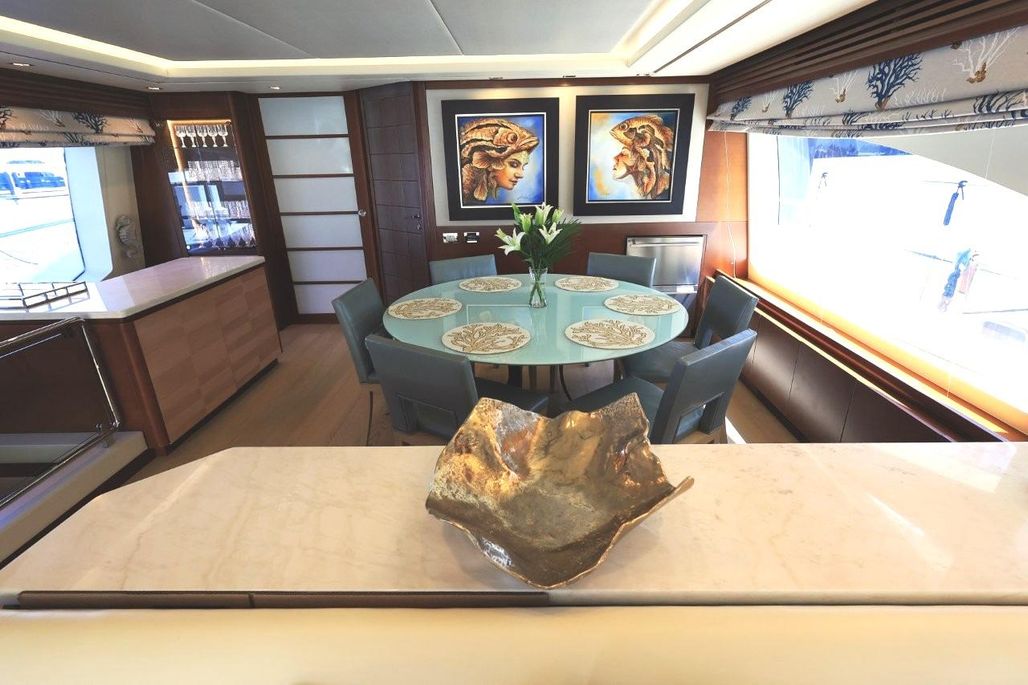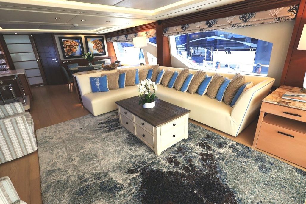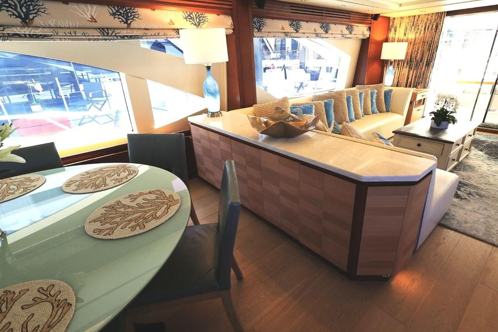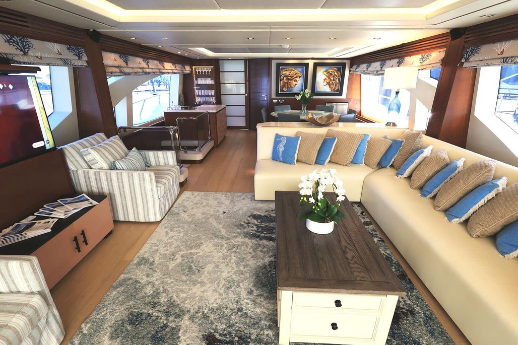 An Ivory granite topped banquet cabinet separates the dining area from the salon and has a circular light green glass table with 6 leather chairs. A set of refrigerated drawers are to the forward corner for easy beverage service. To the portside is a full bar with Ivory granite top and a glass display case with crystal glassware in fitted mounts. Air conditioning is diffused through wood fluted valances the border the salon area and there is attractive indirect lighting in the ceiling features.