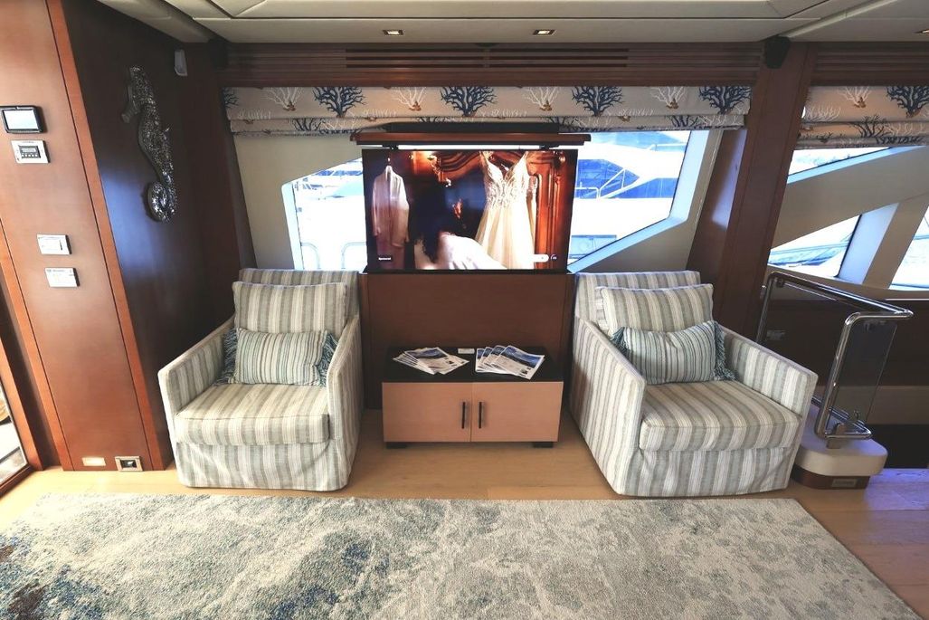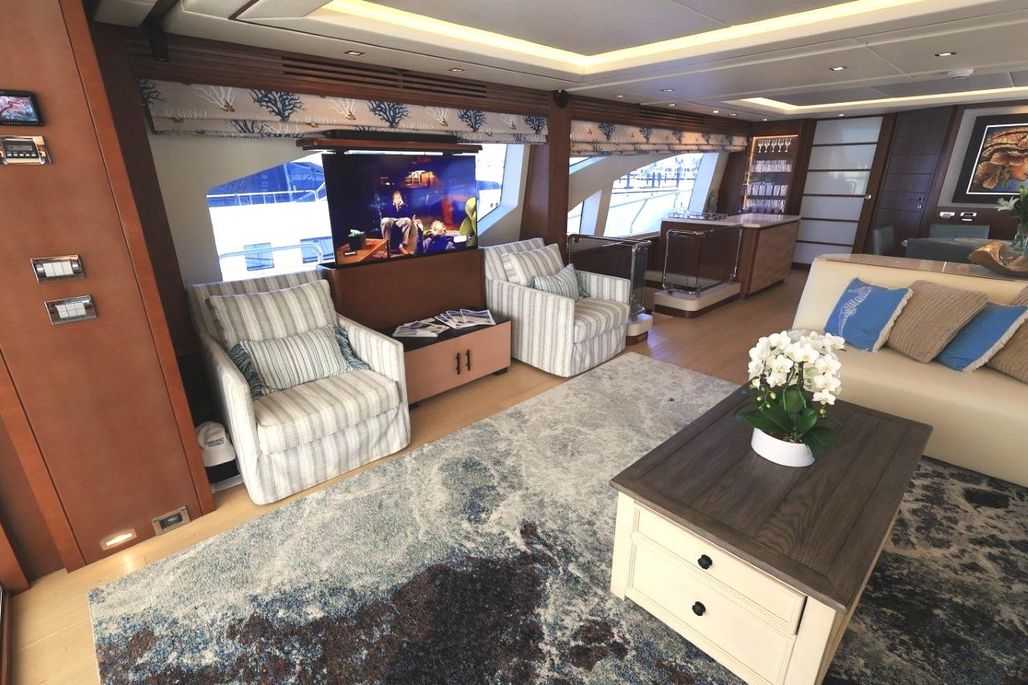 The main deck has a nautical décor with wide-planked, light colored wood laminate flooring and Sea-color themed area rug. A L-shape settee faces aft towards the sliding glass salon doors which have three tiers and can open to basically join the salon and aft deck to double the party space. Portside of the salon has two stylish stripe upholstered chairs and a pop-up 50-inch TV with Bose surround sound. Designer nautical theme electric blinds treat the window and a large sliding matching drapery can close off the aft doors. A center cocktail table is finished in a light wood texture giving the space the feeling of an Italian Beach Club.