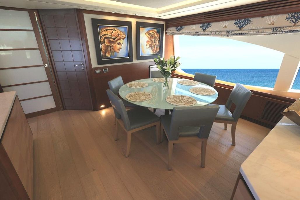 Furthest forward on the main deck there is a raised platform dinette with Ivory granite tabletop and C-shaped settee to the portside. Great place to serve as daytime desk or for a casual lunch. To starboard is the helm with two large leather electric adjustable helm chairs and full console of electronics and monitors. Behind are sliding doors to hide a couple of ships systems electrical panels.