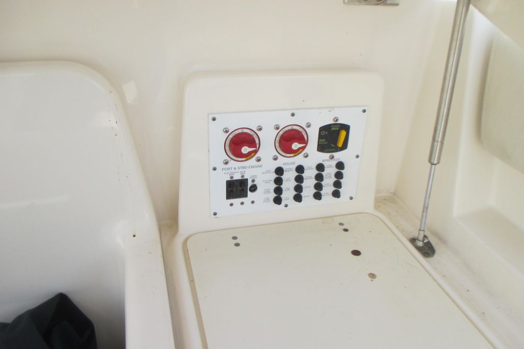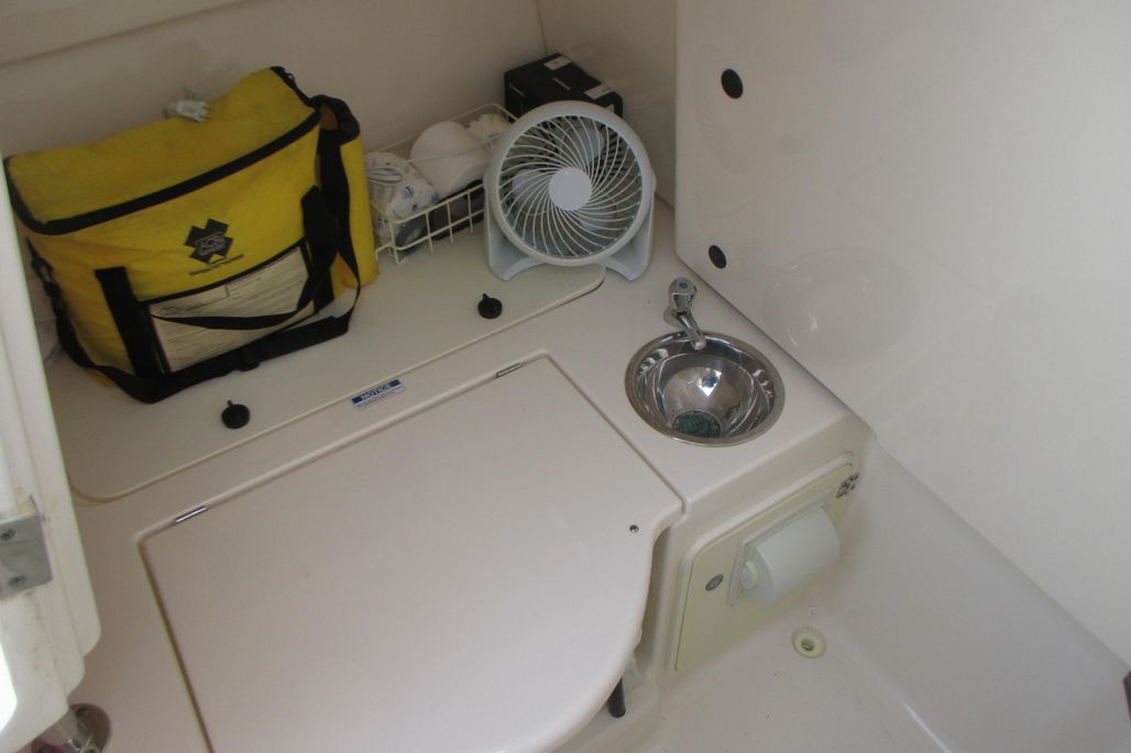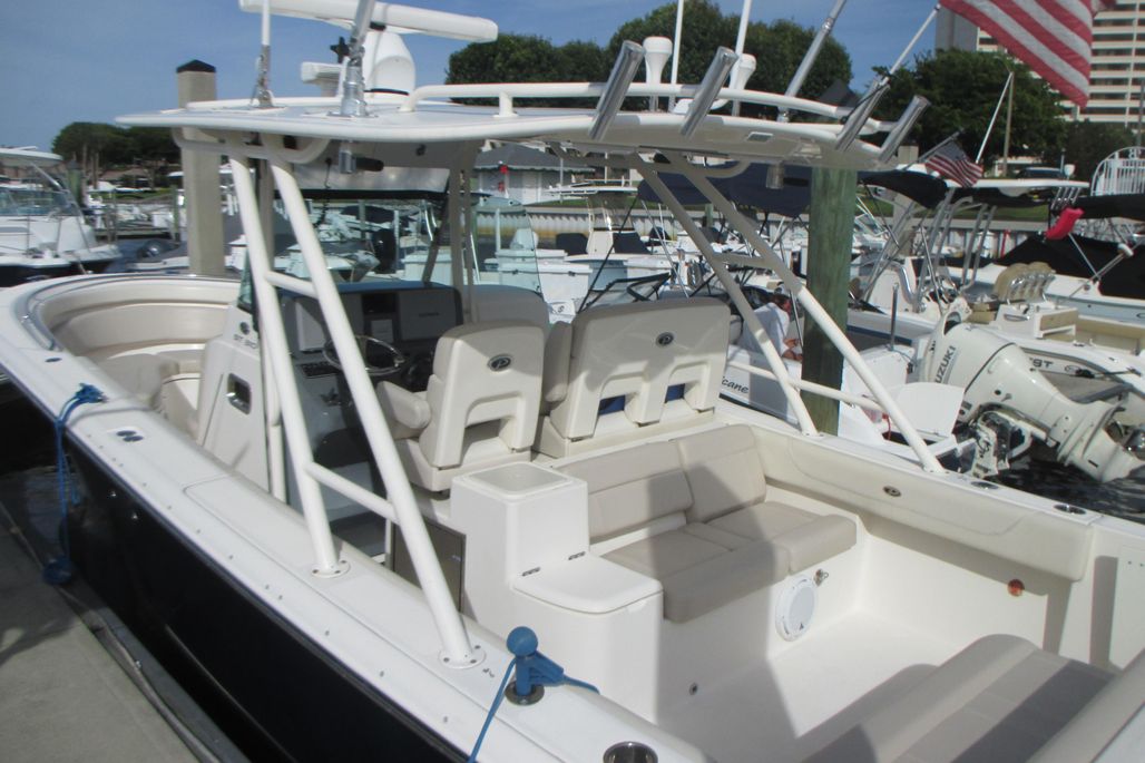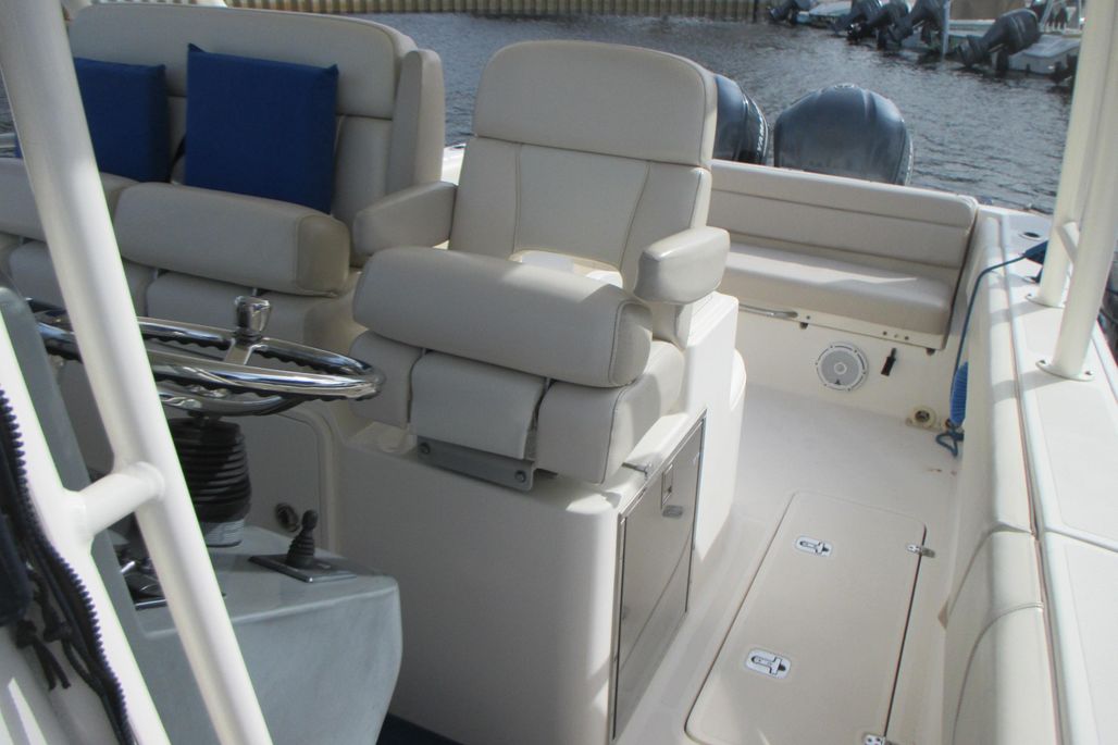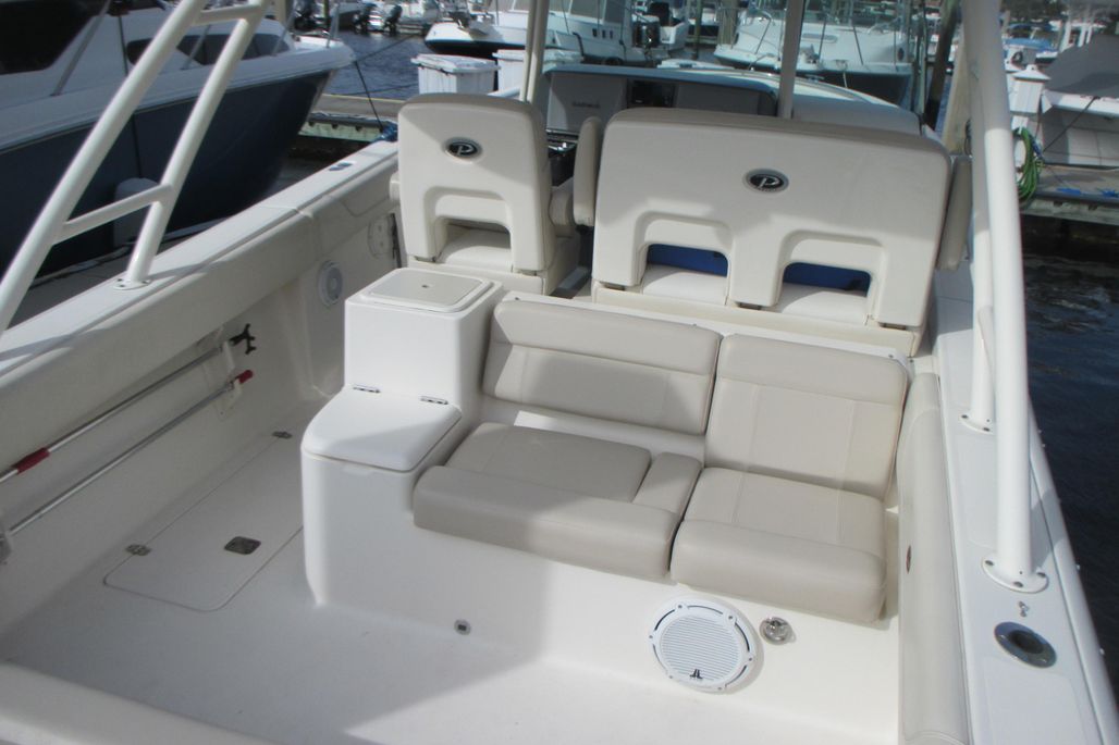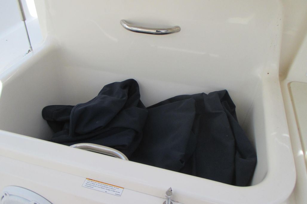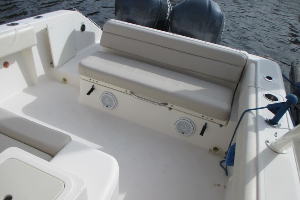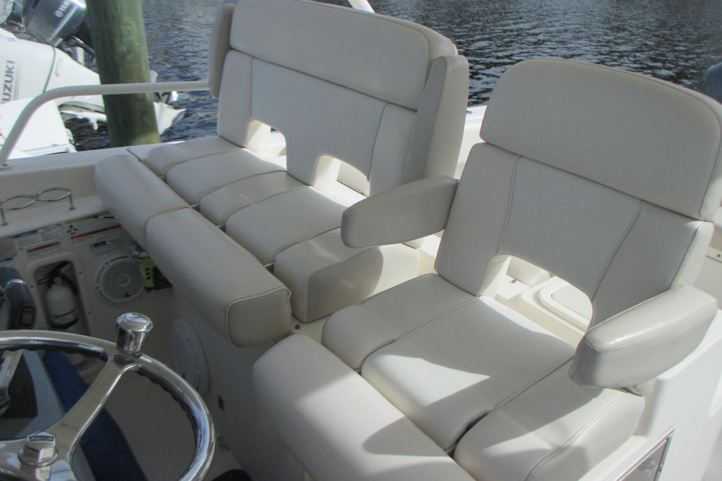 Aft facing seating and forward facing transom seating accommodate as many as six additional guests with softly cushioned upholstery designed to cradle the body just so. Included in the seating closest to the helm are a sink, livewell and insulated cooler. To the starboard side a hinged seat portion opens to reveal cavernous storage large enough to conceal fenders, lines, safety equipment and racks for fishing rods or marine related equipment. The transom lounge hinges aft and features a large removable bin that allows access to the aft bilge and mechanical systems.