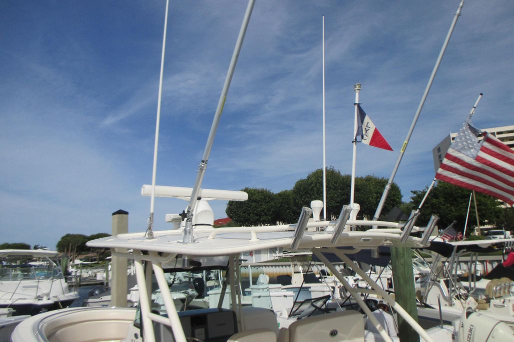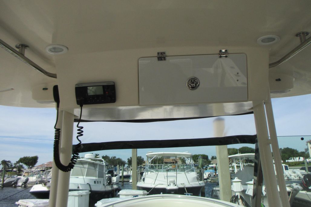 Overhead, the surfboard styled hardtop has dedicated installation details on the topside for outriggers, radar, lighting and antennas. Underneath, the top is finished with built in hand rails, molded speaker ports and an electronics box. All supported by white, powdered coated, heavy duty aluminum tubing.