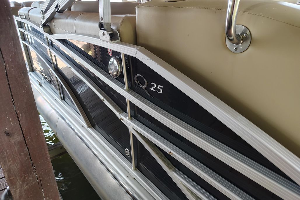 Introducing the 2014 Bennington 2575 QCW I/O, a stunning all freshwater used boat that combines style and performance. With an overall length of 27.5 feet, this aluminum tri-toon beauty is designed for comfort on the water, but don't let her elegant appearance fool you, this Q25 is powered by a robust 430hp Mercruiser 8.2L MAG H.O. Bravo III X inboard/outboard engine promising exhilarating rides and with only 104 hours of use, ensures reliability and power for your aquatic adventures. The raised helm platform and premium console features dark woodgrain accents, custom gauges, captains choice exhaust, an electric engine hatch lift, mood lights, a Garmin depth finder and a Sony stereo system. The boat is filled with luxury pillow top seating including pure-comfort recliners, arm rests with cup holders, a cocktail table and two deluxe rear facing loungers. This boat features a sleek design including a swim platform and a bimini top, perfect for leisurely cruising or entertaining guests. Its spacious layout provides ample room for relaxation and enjoyment, making it an ideal choice for family outings or gatherings with friends. Boat comes with a full cockpit cover.