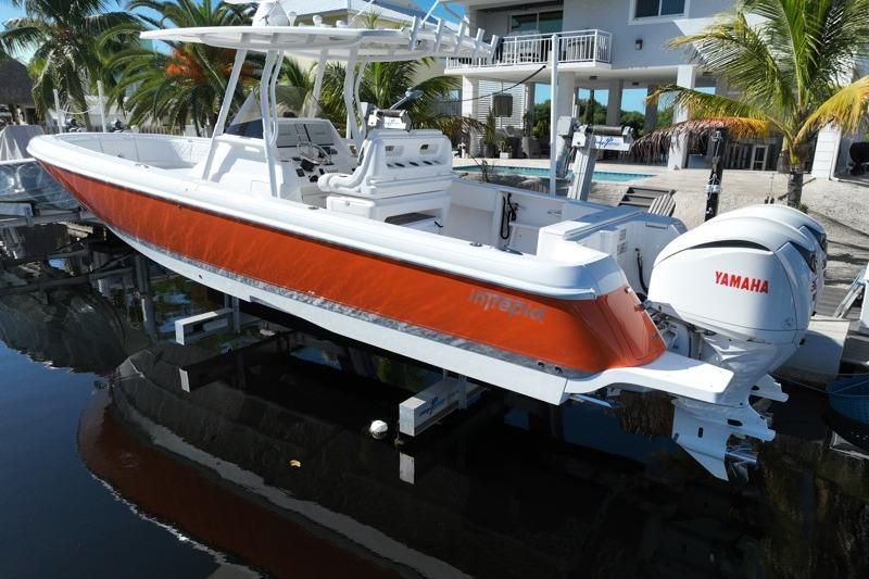 Expansive freeboard tops stylish new sheer and tumblehome transom lines. Signature Intrepid comforts include a spacious head and changing room hidden in the console, plush wraparound forward seating with electric backrests, and integrated or removable rear bench seating.