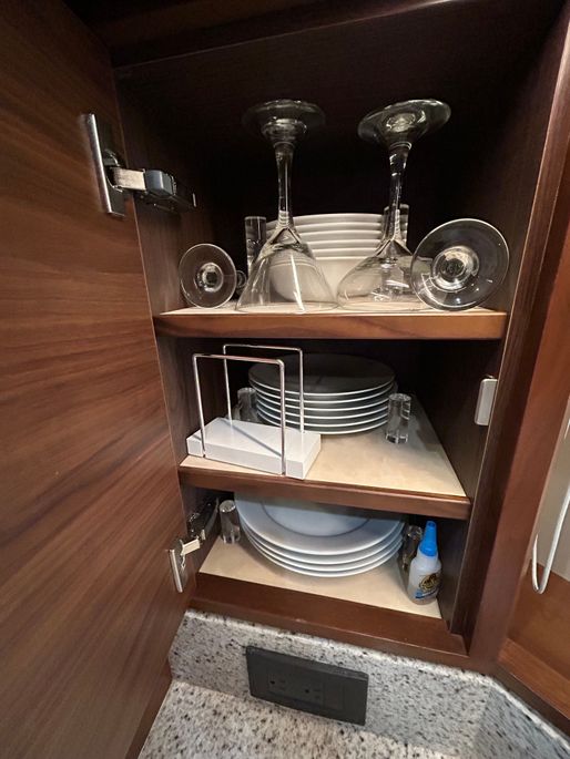 Inside, the S72’s light-filled, contemporary salon welcomes you with sumptuous cream leather upholstery, gloss walnut cabinetry, and expansive panoramic windows that flood the space with natural light. The open-plan galley—equipped with a full-size fridge/freezer, ceramic hob, microwave/convection oven, and ample storage—seamlessly connects to the dining area for effortless entertaining.