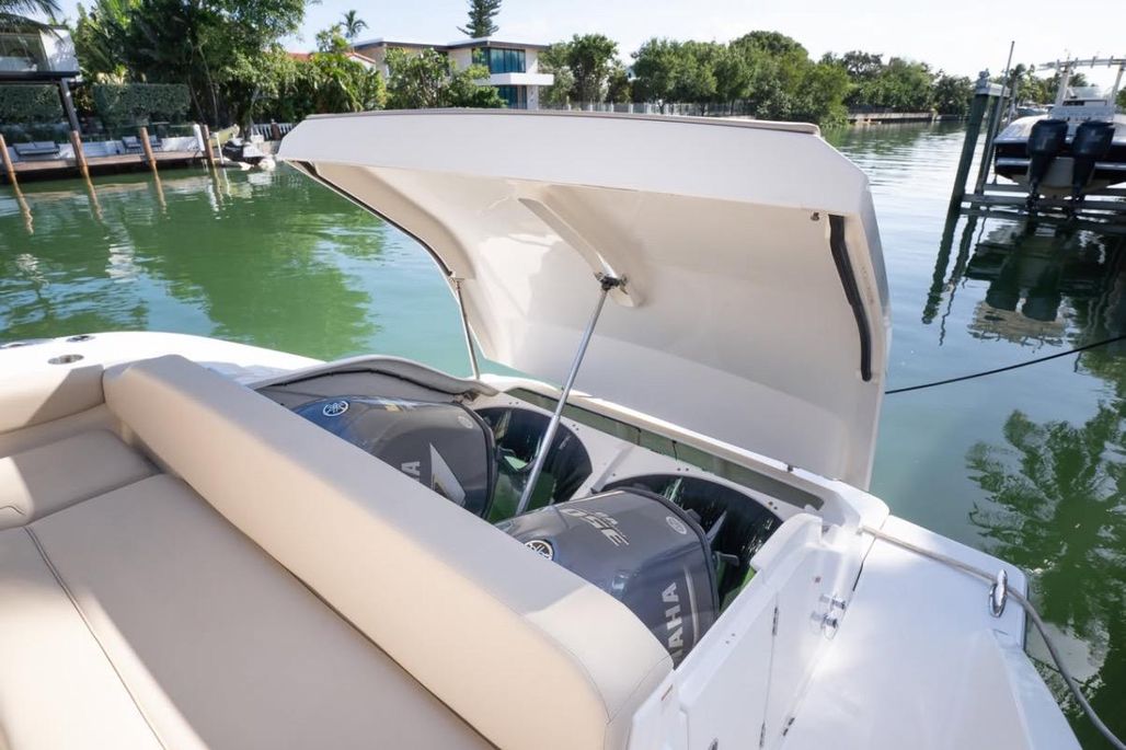 - Engines: Twin Yamaha F350 outboards discreetly concealed in a sound-insulated well, reducing noise and enhancing the boat’s clean, modern profile.