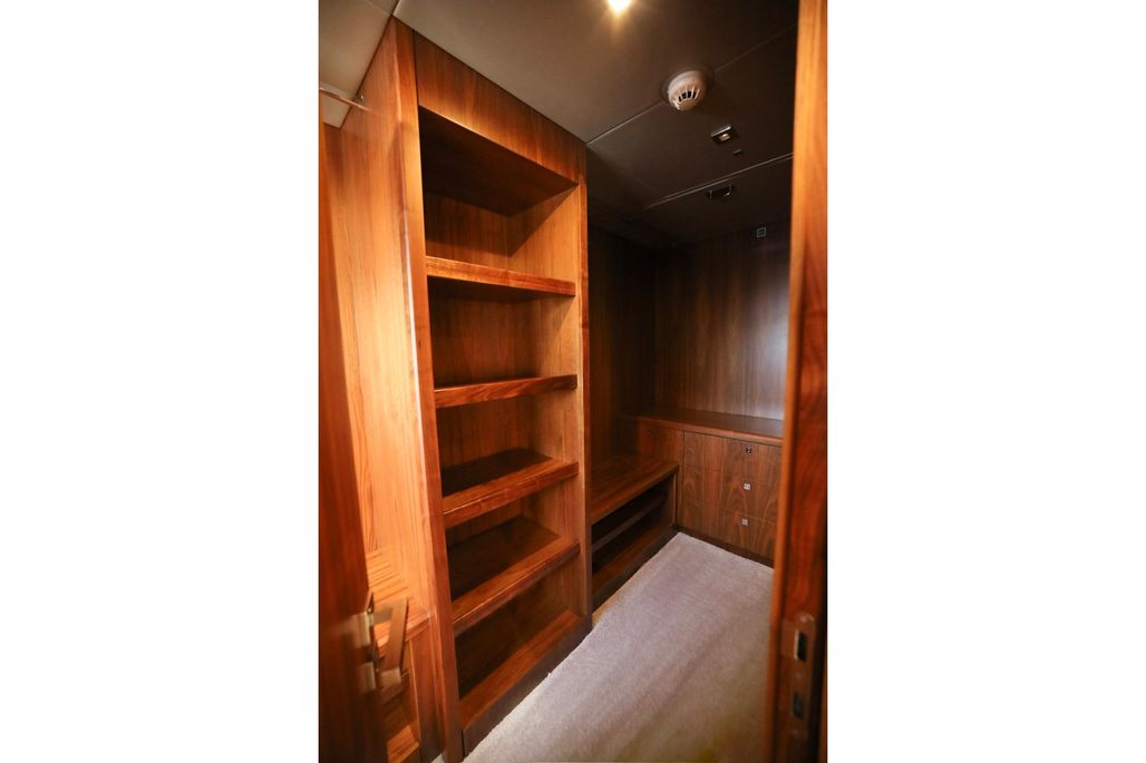 Bathed in satin walnut, MARIN's interior areas are designed in various gray hues styled to create a lush atmosphere. The main deck salon greets guests with two oversized velvet sofas that face each other to create the ideal conversation space. Just forward, a formal dining area features a large table, and the entire room is flooded with natural light thanks to her expansive windows. The crew has easy access to the galley from here, ensuring prompt service.