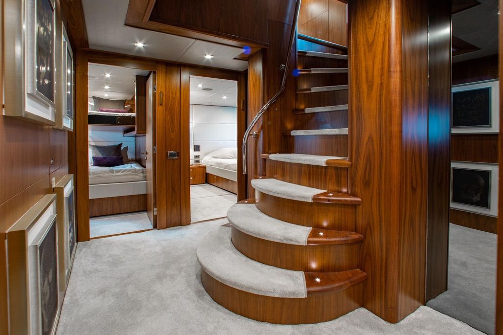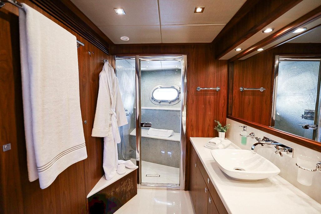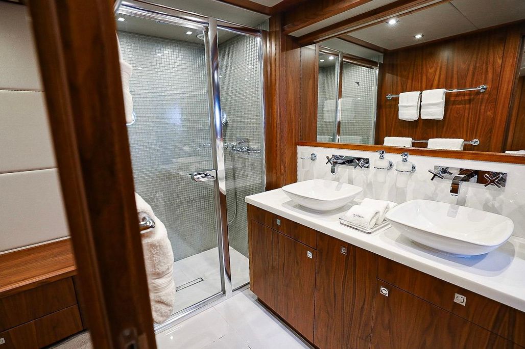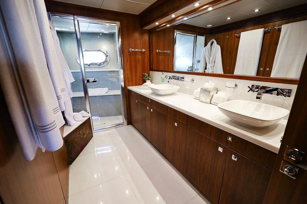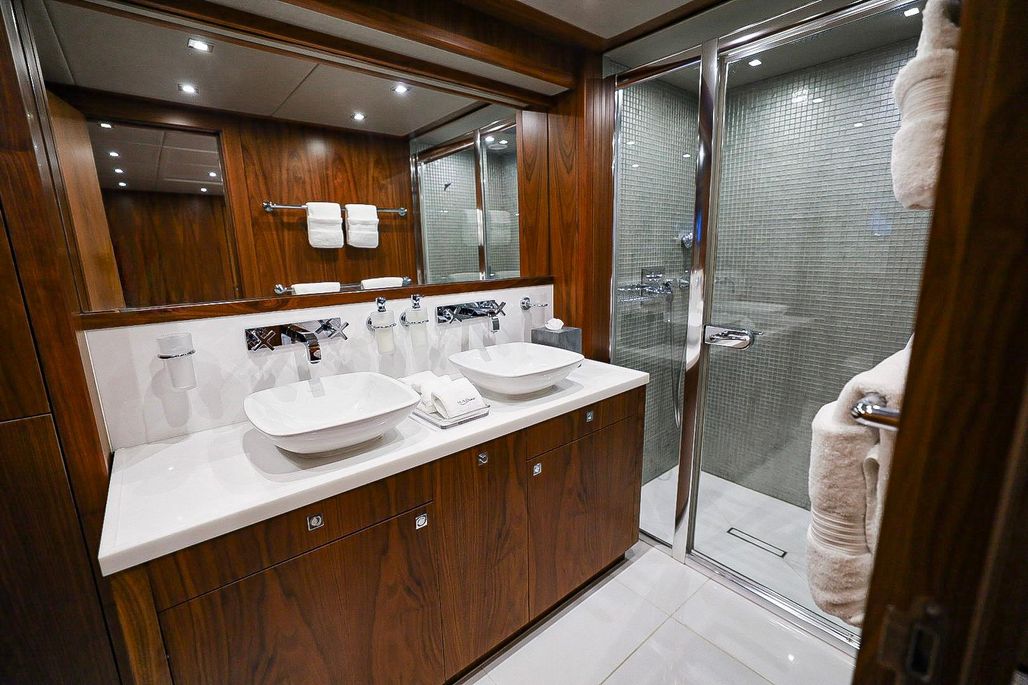 Comfortably sleeping up to 10 guests in five spacious staterooms, accommodations comprise of a main deck master suite with its own lounge space and oversized en suite. A large flatscreen television faces the bed, which has convenient storage space beneath. The remaining guest rooms consist of two spacious double staterooms and two twins, each with their own entertainment system and en suite. Storage space abounds, and décor here is modern and welcoming.
