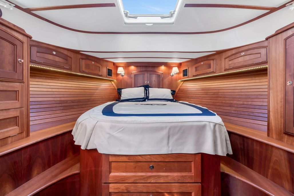 The large and comfortable master cabin is finished in satin varnished cherry with a centerline queen berth, steps on either side and ample storage in lockers and drawers
