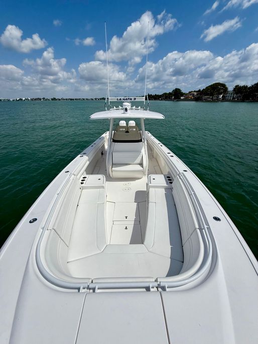 Equipped with the upgraded 392-gallon fuel capacity, this 375 is ideal for offshore runs, family cruising, diving, and fishing.