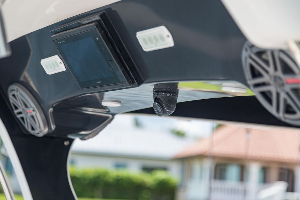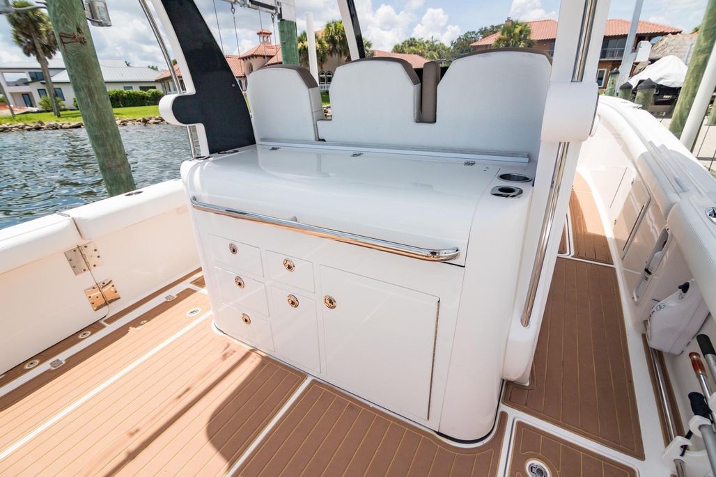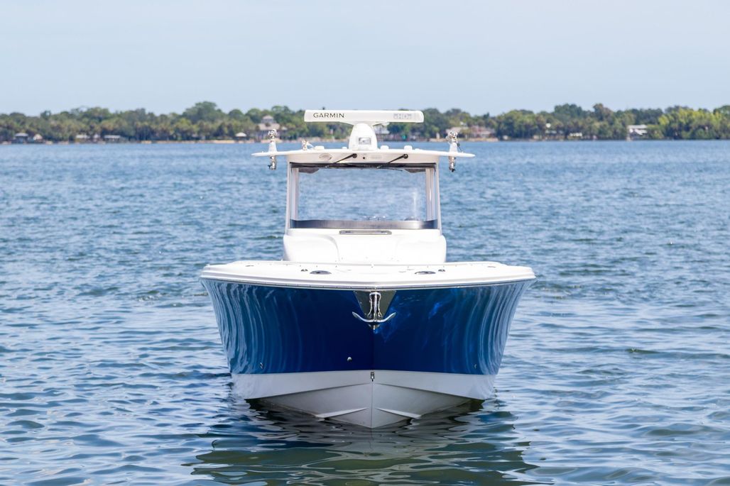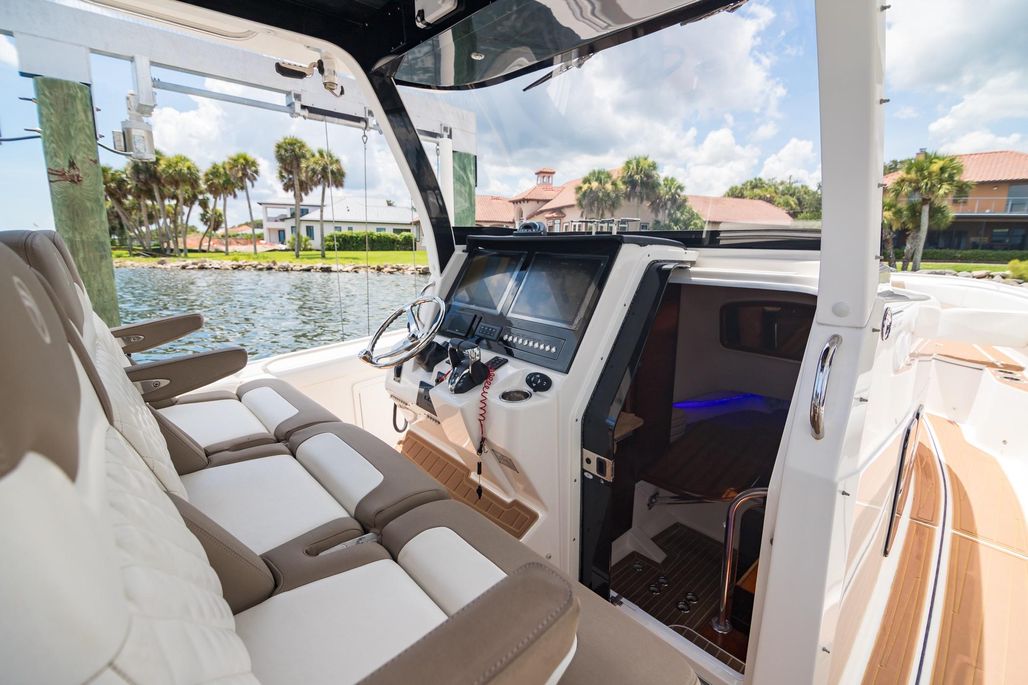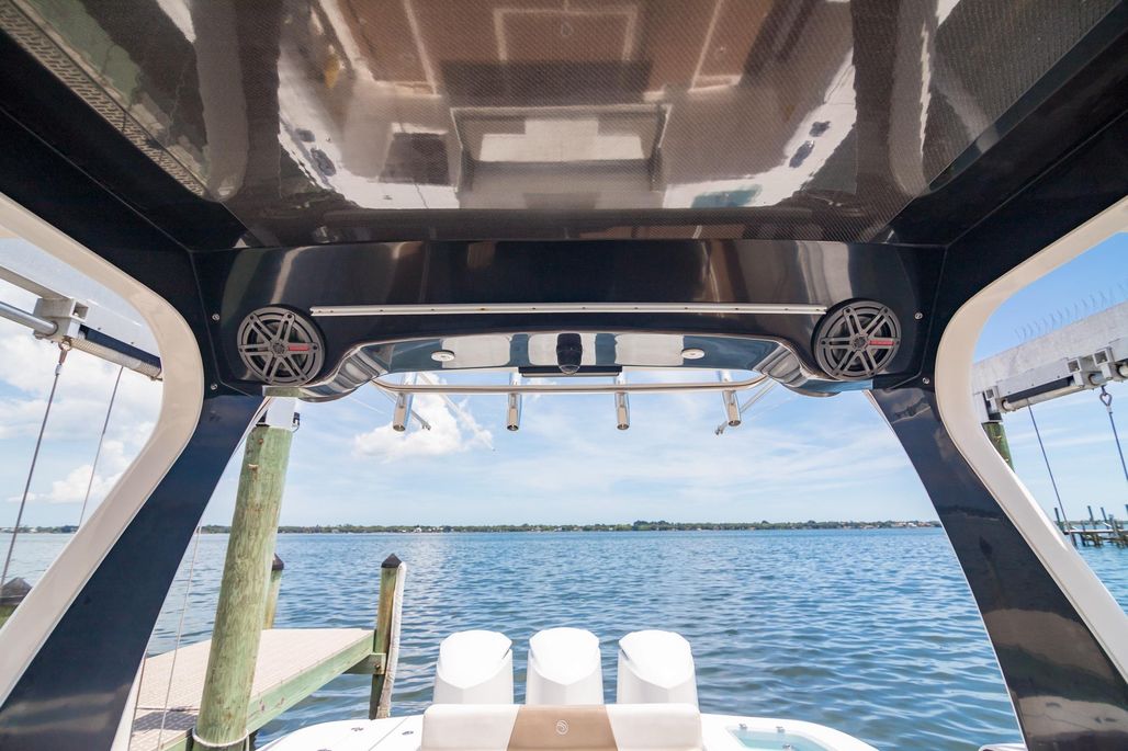 At its core the 368 is a fishing platform. Mounted on the lightweight carbon fiber hardtop a set of Taco outriggers and Garmin 4’ open array radar to spot birds. Electric reel outlets for deep dropping The transom houses a 45 gallon livewell, a pair of 200-quart integrated, insulated fishboxes live in the deck, there’s a bait-prep station with a sink in the transom, fresh and raw water washdowns. Twin Garmin MFDs at helm, smaller Garmin aft facing in cockpit. LED lighting throughout. Enjoy adjustable electric Captains seat and excellent visibility from helm thru windshield of frameless design that eliminates glare without distorting your view, even when you look through the curves in the sides. The twin-step hull design using the Single Piece Infusion Technology creates a lightweight (under 8500 lbs) quick ride to the fishing grounds. Owner reports comfortable cruise of 33 knots at 3700 rpm burning only 1.4mpg. Yes, it will top out well over 50 kts.