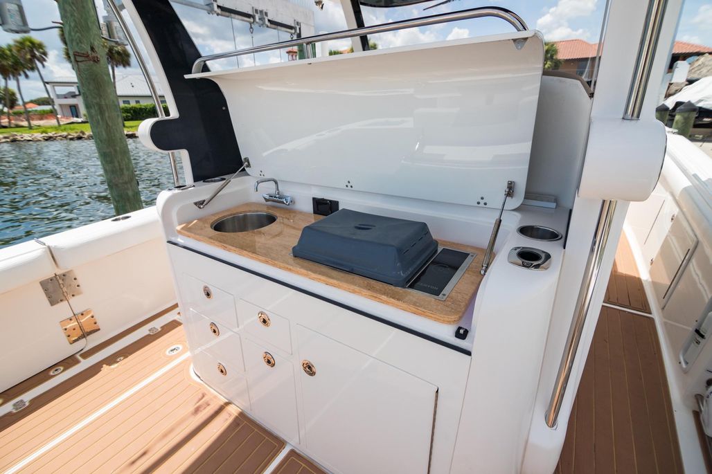 A family friendly center console design; the console has been expanded quite a bit to make room for a comfy, air-conditioned cabin. The walk-in console cabin is perfect for a couples weekend getaway: a galley to prepare a quick meal equipped with newer stainless refrigerator, microwave and small dinnette. Rest comfortably as you chill with 12V air conditioning in the full-sized berth. The fit and finish of Edgewater quality is obvious in the natural wood and subdued lighting. Another sandbar option is cooking on the electric grill located behind the large helm.