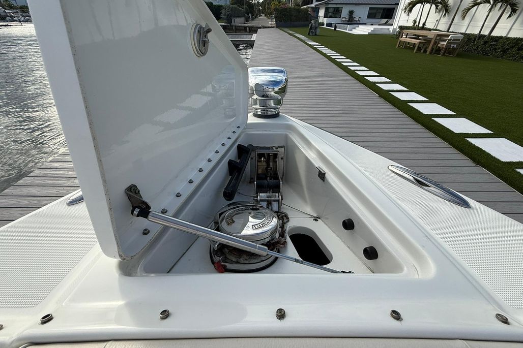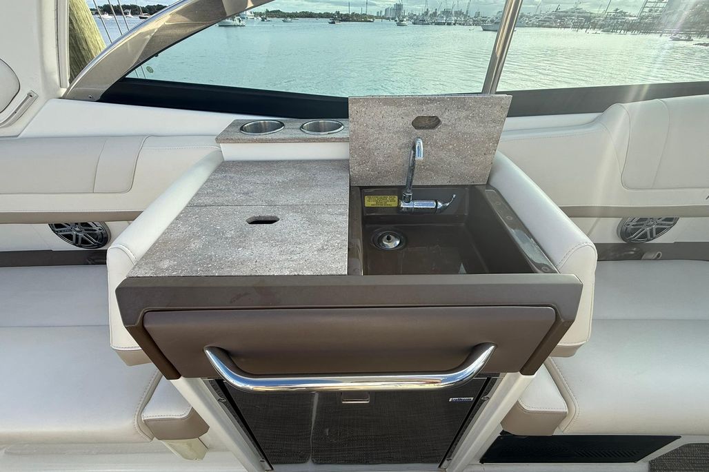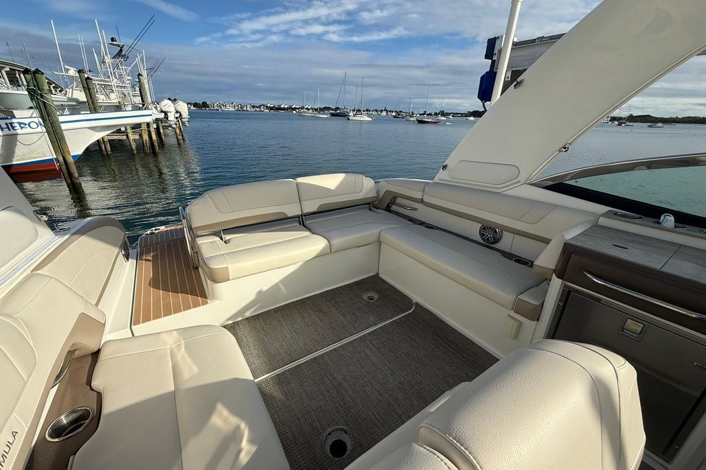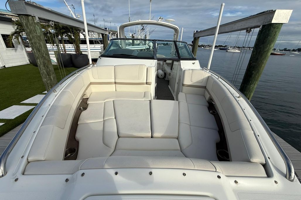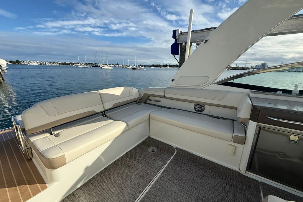 Equipped with Raymarine electronics and a premium JL Audio sound system. Spacious cockpit and bow seating make it great for cruising and entertaining.