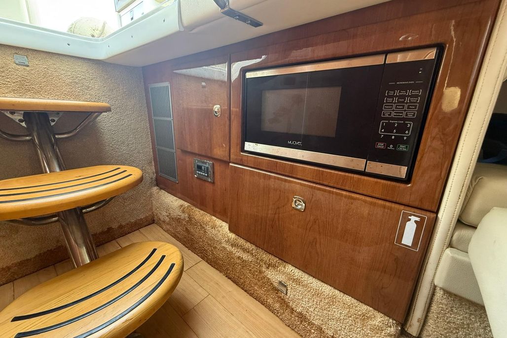 Below deck features a small cabin with a berth, enclosed head, microwave, and TV, ideal for overnight stays or extended days on the water.