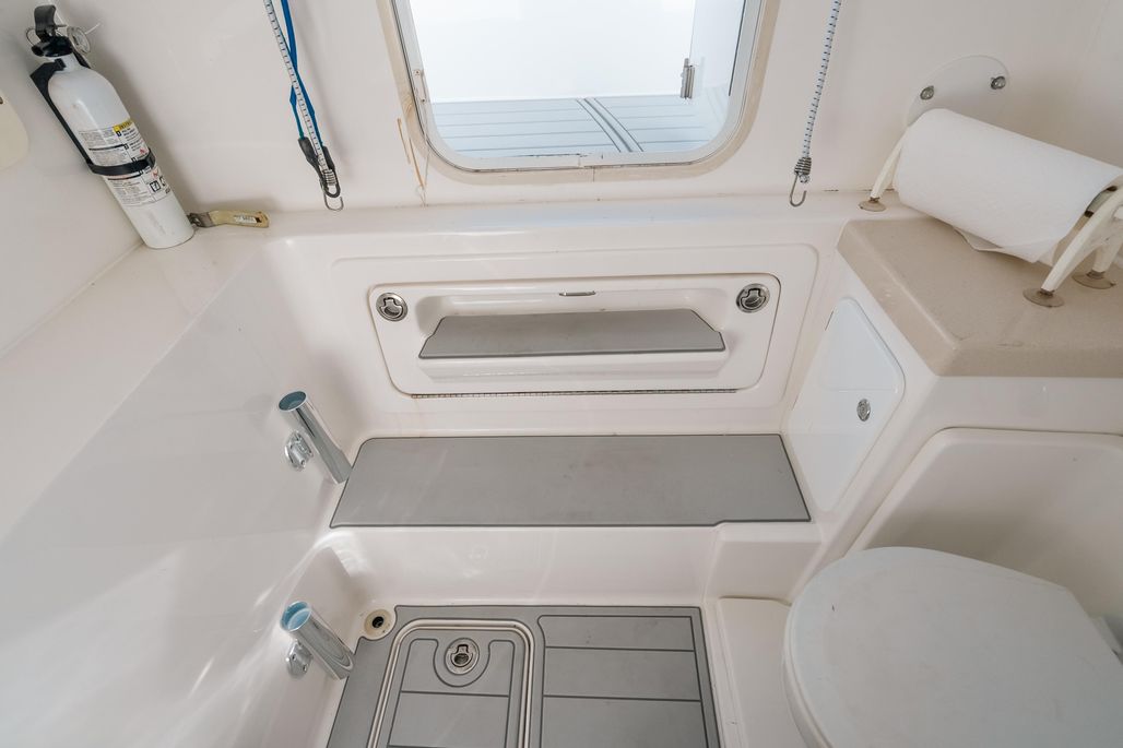 Designed for serious offshore performance and comfort, this boat is equipped with a Seakeeper 3 for enhanced stability, a dive door for easy water access, and a well-appointed head inside the console. Forward seating and rear jump seats provide versatile seating for cruising, fishing, or entertaining.