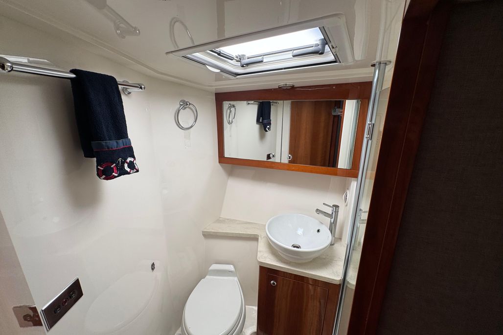 The aft, full beam cabin has large port lights with optional portholes either side for natural light and cross ventilation. A large skylight under the forward saloon windscreen provides additional light to this cabin, creating a bright and welcoming space.