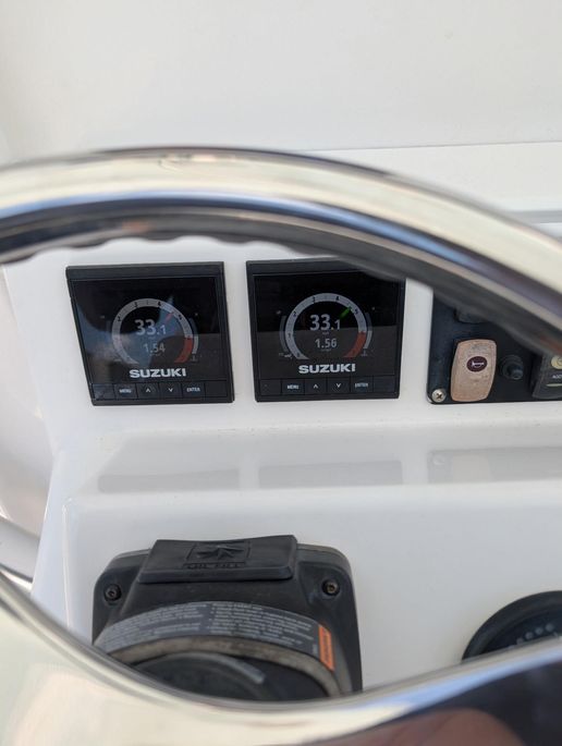 The vessel is powered by twin Suzuki DF200AP outboards, each producing 200 horsepower. At wide-open throttle (6000RPM), the boat reaches a top speed of approximately 48.6 mph (42.2 knots). Cruising speed is around 34.4 mph (29.9 knots) at 4000RPM, offering fuel efficiency of roughly 1.65 mpg. With a 204-gallon fuel tank, the estimated cruising range is approximately 336 nautical miles with a 10% reserve.