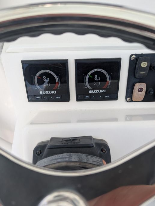 The boat is equipped with 3-blade stainless steel props, SeaStar hydraulic steering, and twin Suzuki DF200AP four-stroke outboards featuring fly-by-wire throttle control. Both engines run on gas/petrol. The certified maximum passenger capacity is 12.