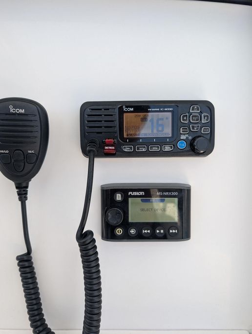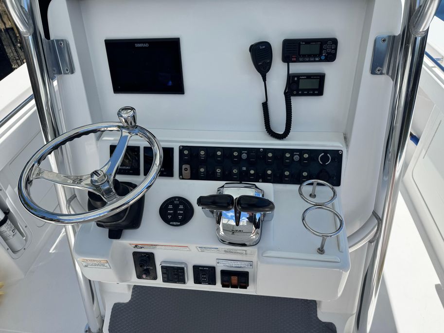 Electronics include a Simrad multi-function display with chart plotter, an ICOM IC-M330 VHF marine radio, a Fusion MS-NRX300 stereo system with Bluetooth, and a Suzuki digital engine monitoring system that provides real-time speed and fuel economy data. A Ritchie-style compass is also mounted at the helm. Audio is powered by JL Audio speakers in both the bow and cockpit areas.