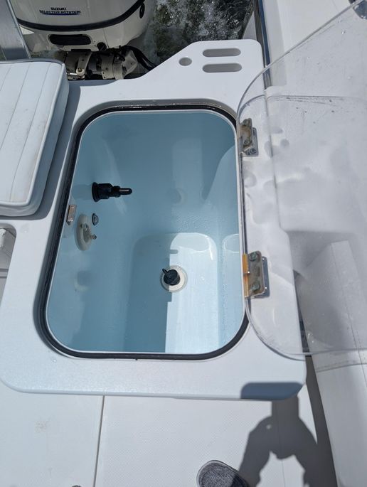 The 272TE includes a 30-gallon transom live well, twin insulated in-deck fish boxes (27 gallons each), and an 80-gallon forward coffin box with cushions. The helm area is outfitted with premium diamond-stitched dual bolster helm seats, a leaning post with integrated tackle storage, and a T-top with rocket launchers. Additional seating includes a fold-down transom bench seat and a forward console seat, providing comfort and flexibility for both fishing and cruising.