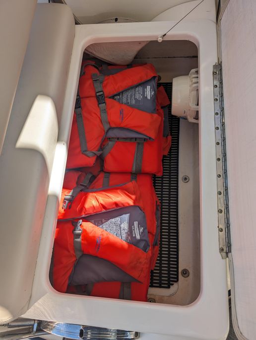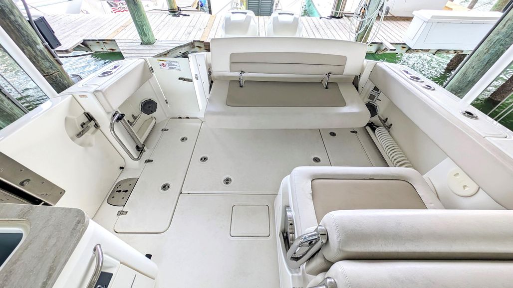 Fishing Package: Aft hardtop rocket launchers (5), raw-water washdown, rod holders (transom mounted (stainless steel) (3)), stainless steel toe rails with under gunnel storage shelf, Port & Stbd Fish Lockers with Macerator.