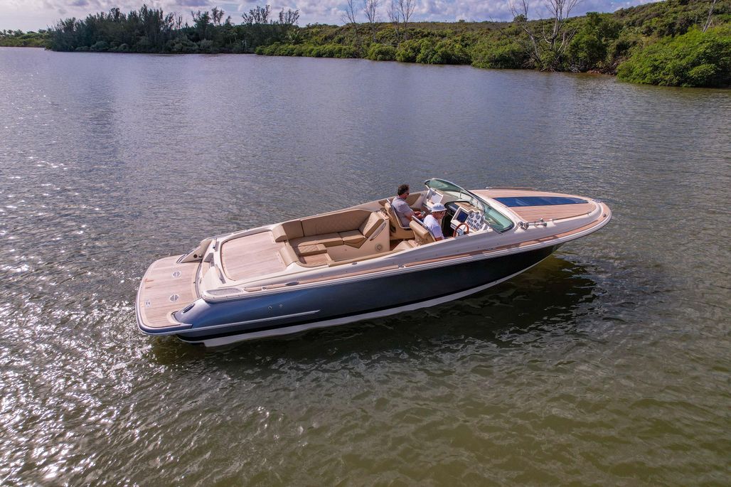 A modern classic. The Corsair 28 blends Chris-Craft’s mahogany-era lines with contemporary build quality and a ride that inspires confidence. The signature tumblehome stern, teak Heritage Package, and stainless hardware turn heads at every dock; the deep-V hull and flared bow deliver a dry, composed run when the chop picks up. It’s the rare dayboat that feels equal parts elegant cruiser and athletic runabout.