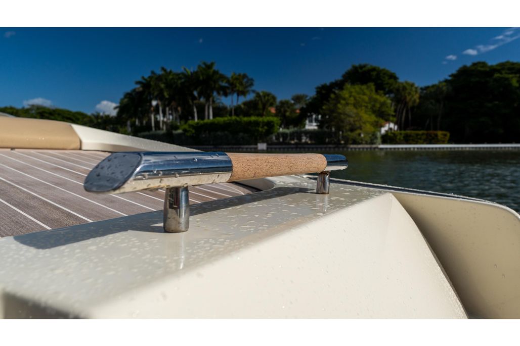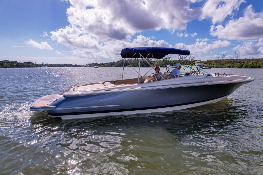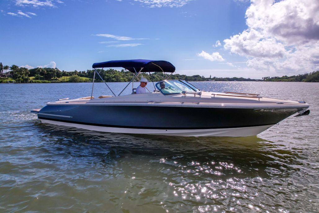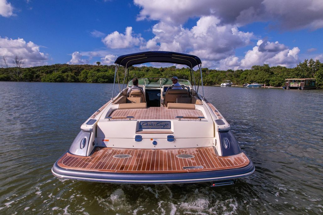 Step aboard and you’ll find an inviting, social cockpit with wraparound lounge seating, a double-wide helm seat to share the view, and a sun-pad over the engine hatch—an effortless setup for sandbar days, harbor tours, or twilight cruises. Fit and finish are unmistakably Chris-Craft: hand-finished teak, diamond-stitched upholstery, and robust hardware throughout. A compact cuddy forward with marine head and berth/storage adds real utility for quick changes, kids’ naps, or stowing gear.