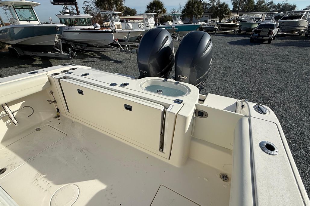The Cobia 261 Center Console is a versatile boat designed for both serious anglers and families seeking a comfortable day on the water. Measuring 26 feet in length, it boasts a sharp entry and flared bow, ensuring a smooth, dry ride even in choppy conditions. Its spacious deck layout includes ample seating, a well-equipped leaning post, and plenty of storage for gear. Anglers will appreciate the large baitwell, rod holders, and fish boxes, while everyone will enjoy the convenience of the enclosed head. Powered by reliable Yamaha outboard engines, the Cobia 261 offers excellent performance and fuel efficiency, making it perfect for offshore fishing, cruising, and watersports. With its combination of functionality, comfort, and quality construction, the Cobia 261 is an excellent choice for anyone looking to maximize their boating experience.