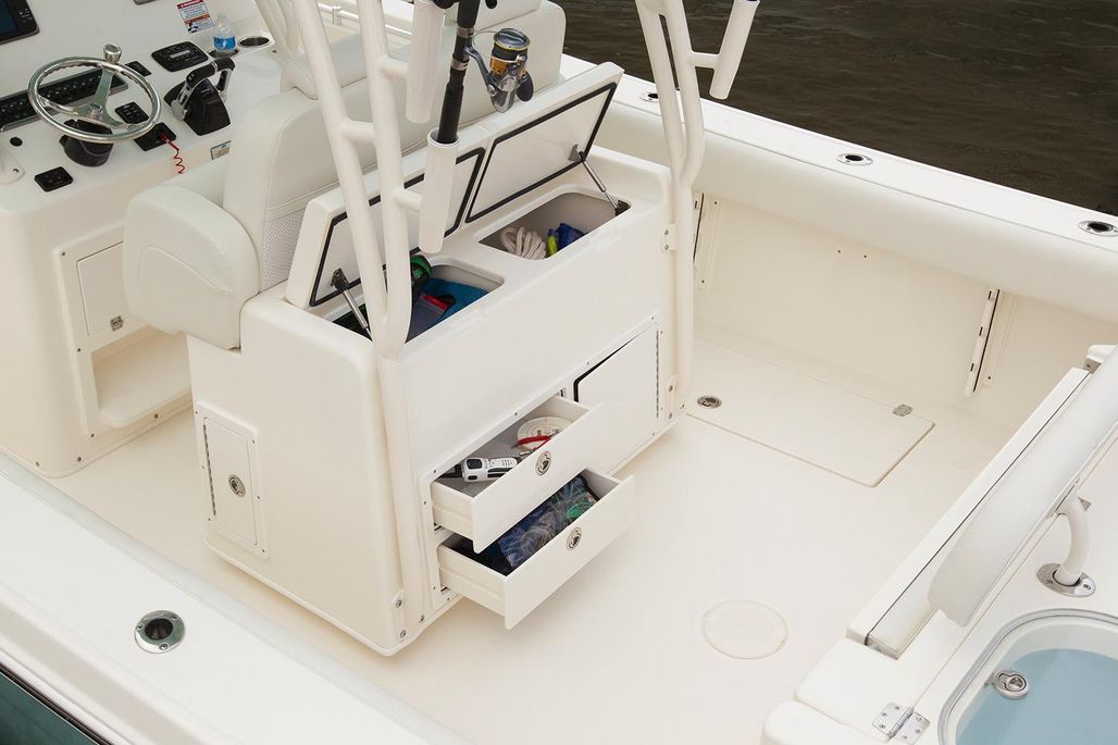 The Cobia 296 CC is designed big to handle any conditions Mother Nature throws its way. It also fishes big with twin 28 gallon livewells and a cavernous cockpit with flip down aft seating and two in-deck 64″ macerated fishboxes. All the lures, leaders and terminal gear you own will fit neatly into the tackle organizers in the leaning post and console and your dead baits will be kept fresh and ready for rigging in the two insulated boxes in the tackle station.