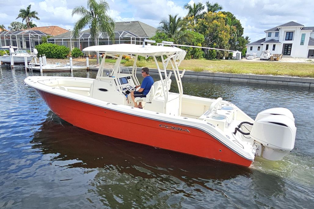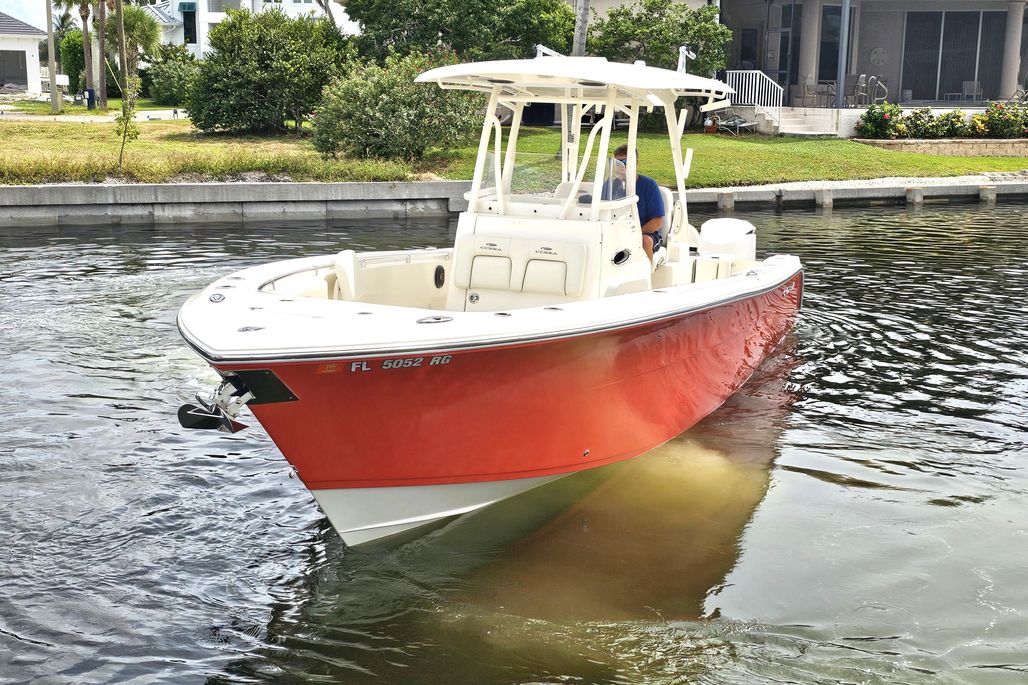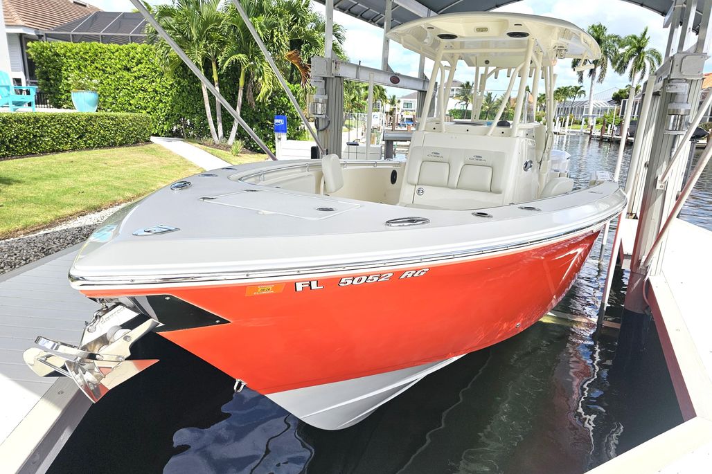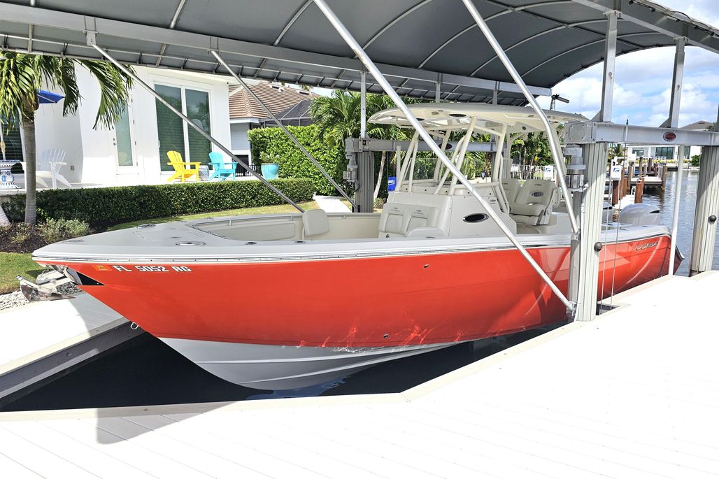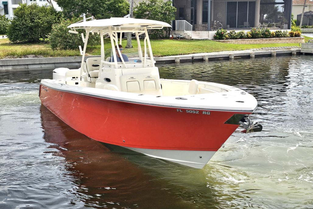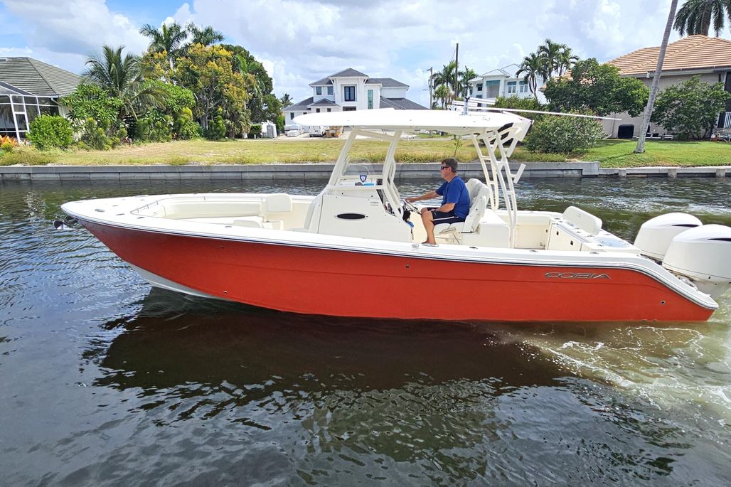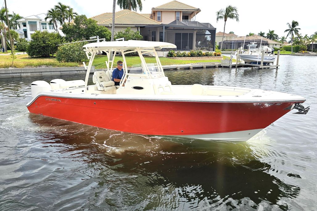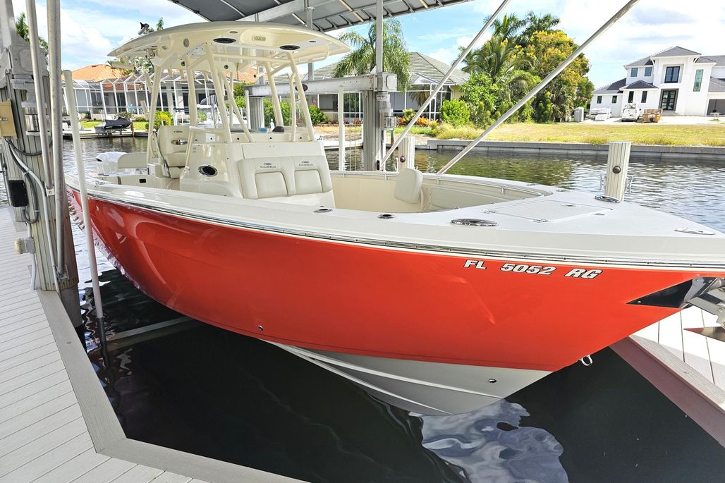 Always stored on a covered boat lift, 2017 Cobia 296 Center Console with twin Yamaha Four Stroke 300 hp outboards. Meticulously maintained by original owner. Custom Orange from the factory. She is in near flawless condition and won't disappoint. With her 10-foot beam she can handle very well. The 300 outboards really push her at a nice pace.
