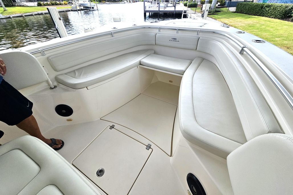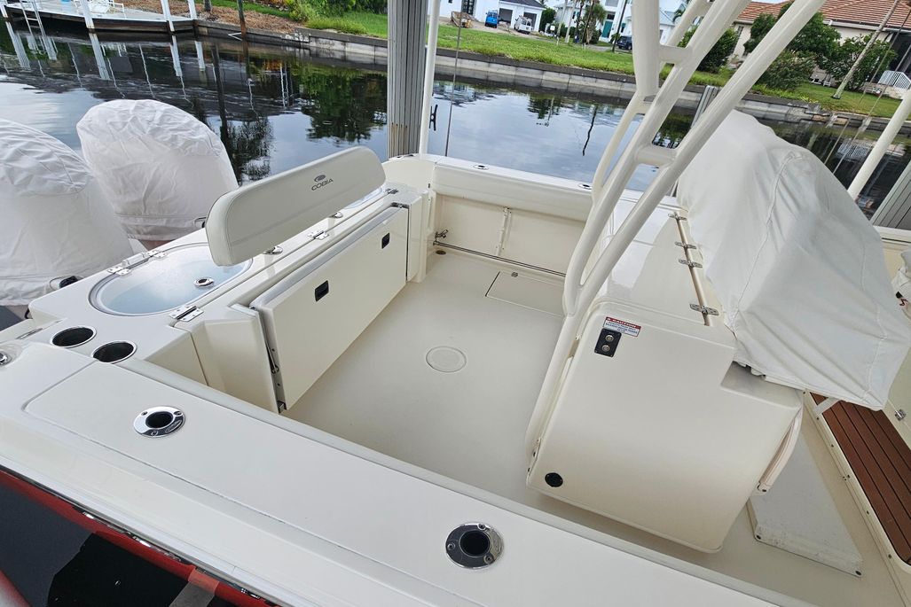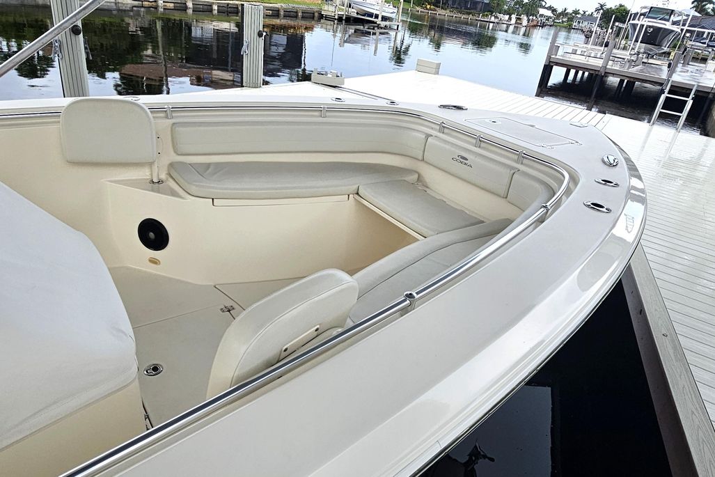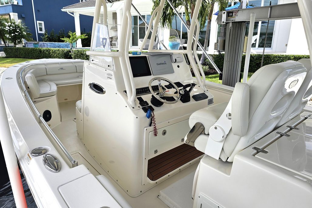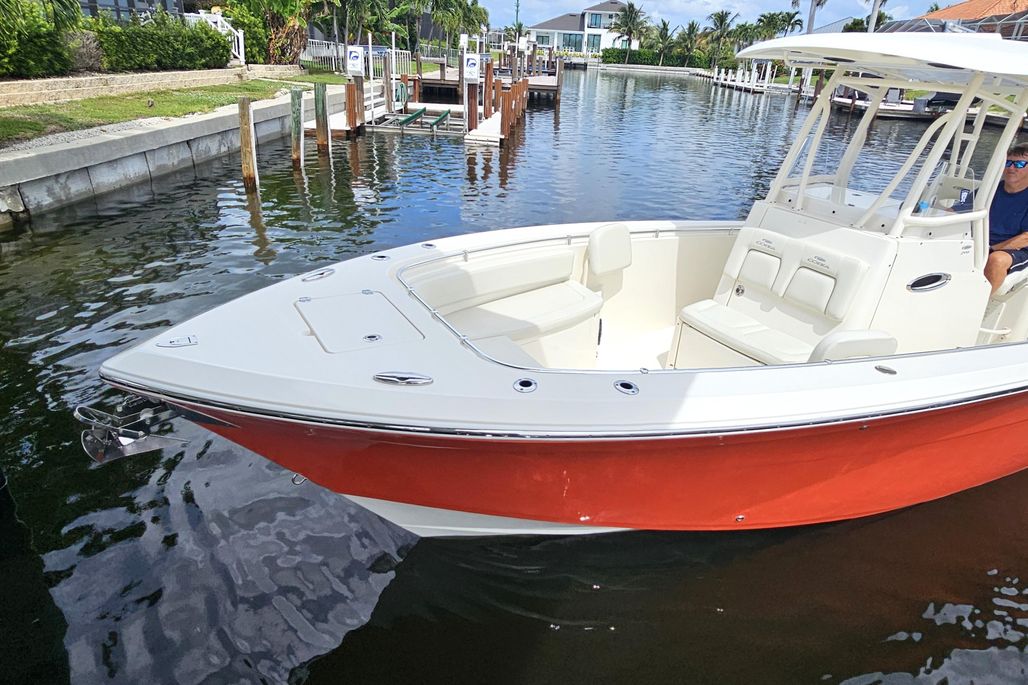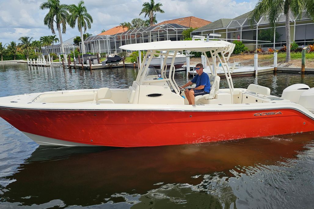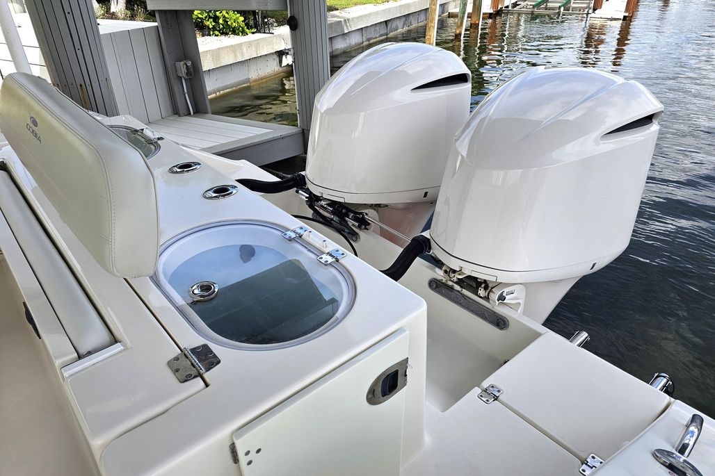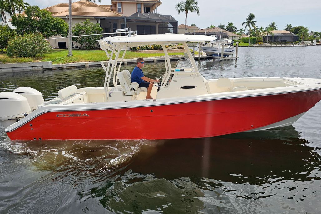 Always stored on a covered boat lift, 2017 Cobia 296 Center Console with twin Yamaha Four Stroke 300 hp outboards. Meticulously maintained by original owner. Custom Orange from the factory. She is in near flawless condition and won't disappoint. With her 10-foot beam she can handle very well. The 300 outboards really push her at a nice pace.