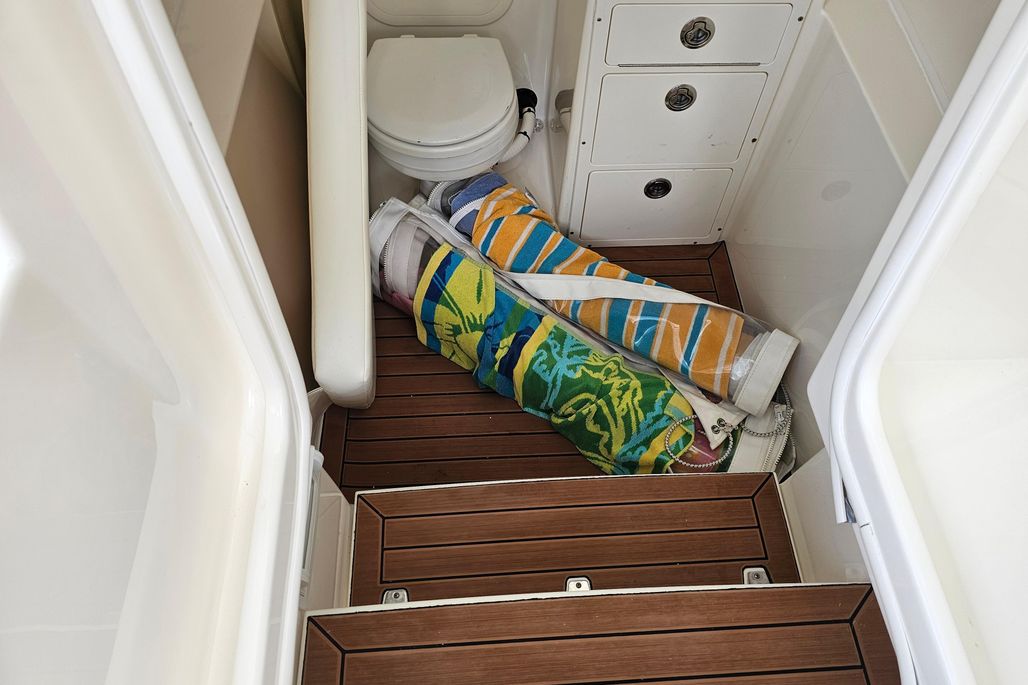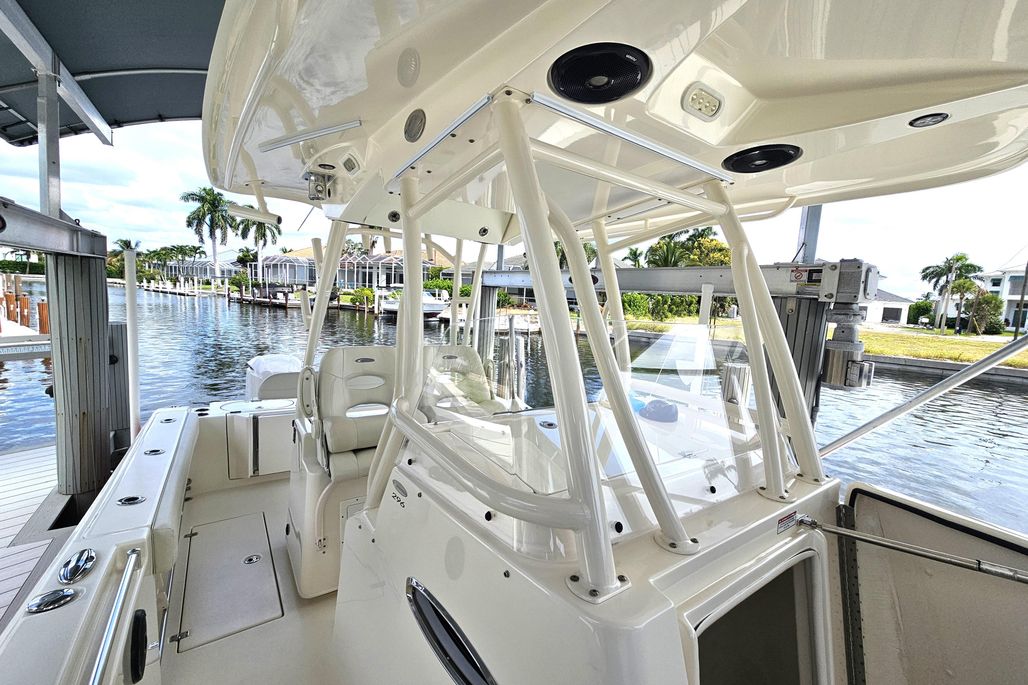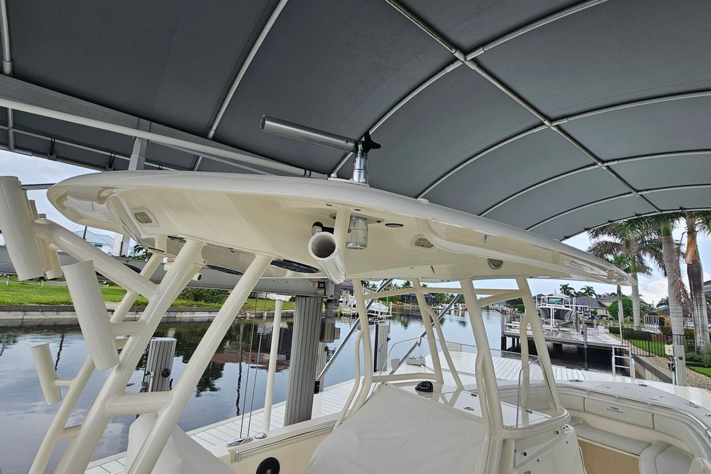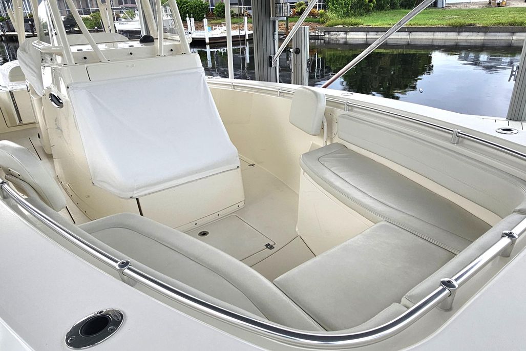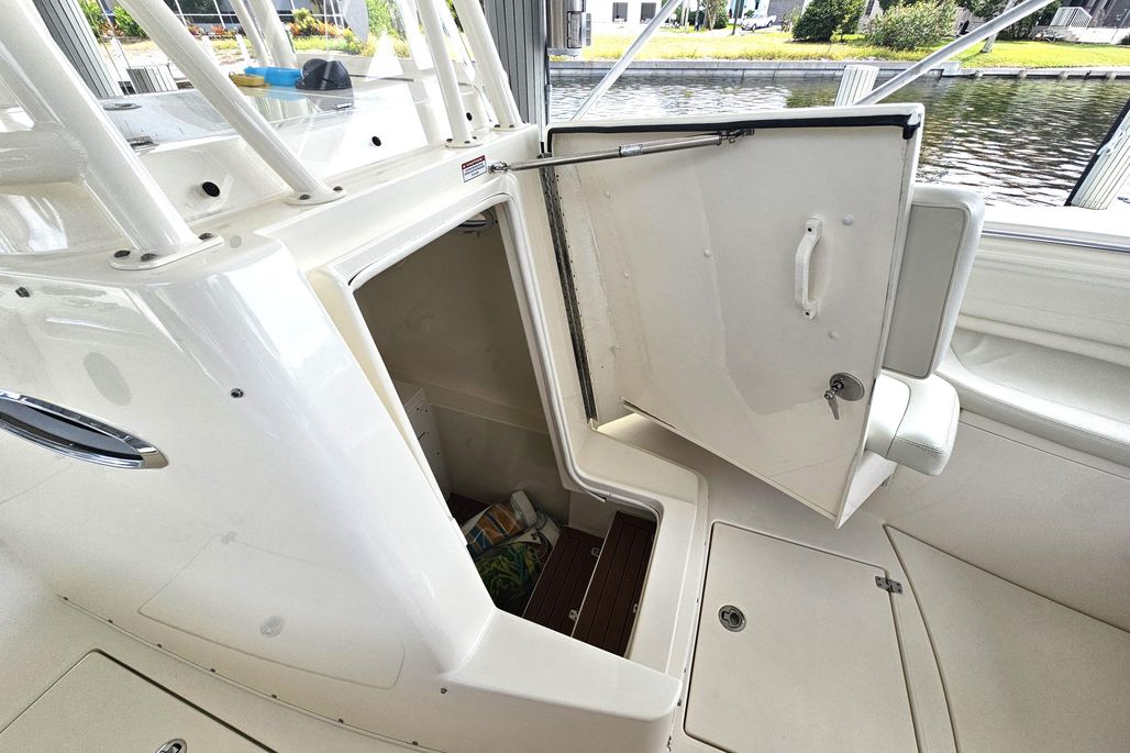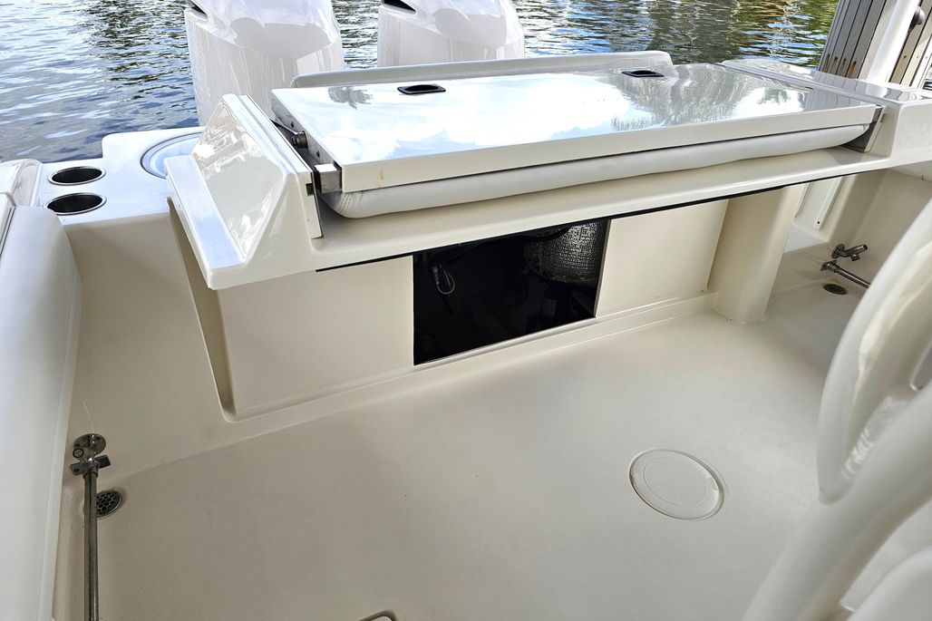Very nicely equipped featuring a factory T-Top with clear curtains and wings. Hull cover and a full storage cover, cushioned bow seating with electric adjustable and filler cushion, Electric anchor windless, stainless-steel claw anchor, Taco Outriggers, comfortable helm chairs, center bait prep station, Transom fold down bench seat, twin transom 28-gallon livewells, Transom door, in-deck fishboxes, Full size head compartment with flushing toilet, Forward sunshade.