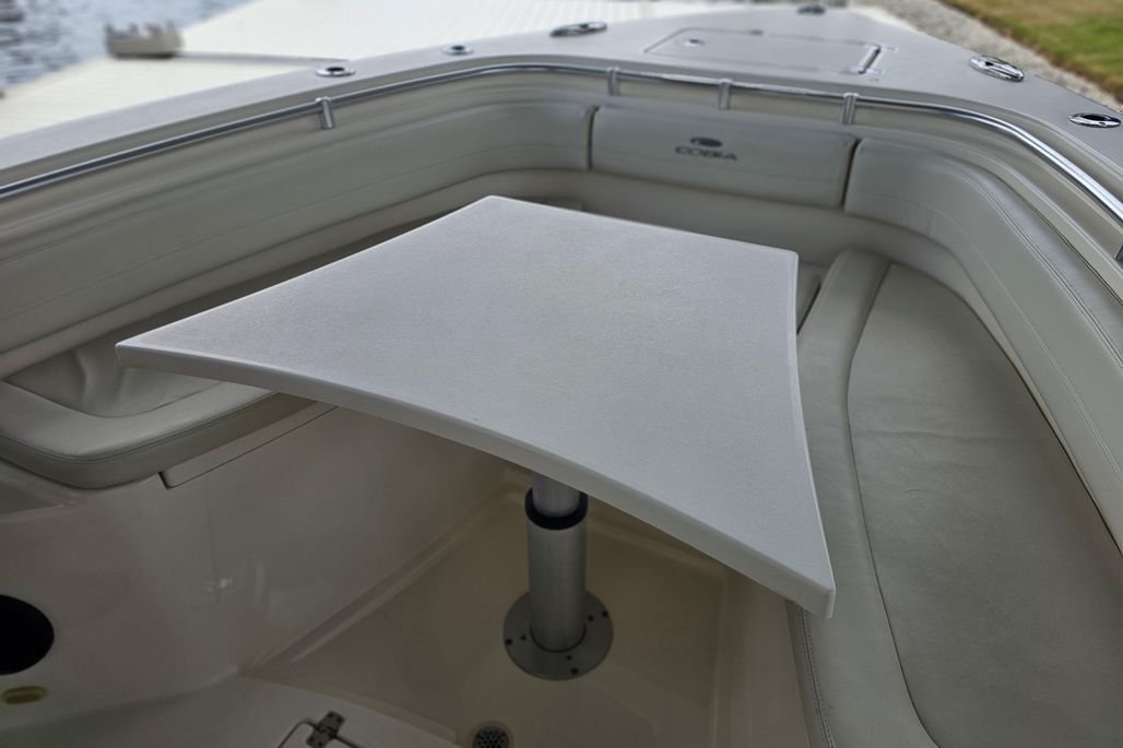 All deck hardware and the bow rail are recessed and the deck is level from stem to stern for 360 degree fish fighting maneuverability. Integrated into the console and leaning post, the metalwork of the optional hard top carries the clean lines and stylish looks of the deck upward to a two-tone top with molded-in pods for speakers, three-hued LED lighting and spreader lights. Comfort features include soft and elegantly appointed upholstery on seating for 11 and a full step-down console with forward access.