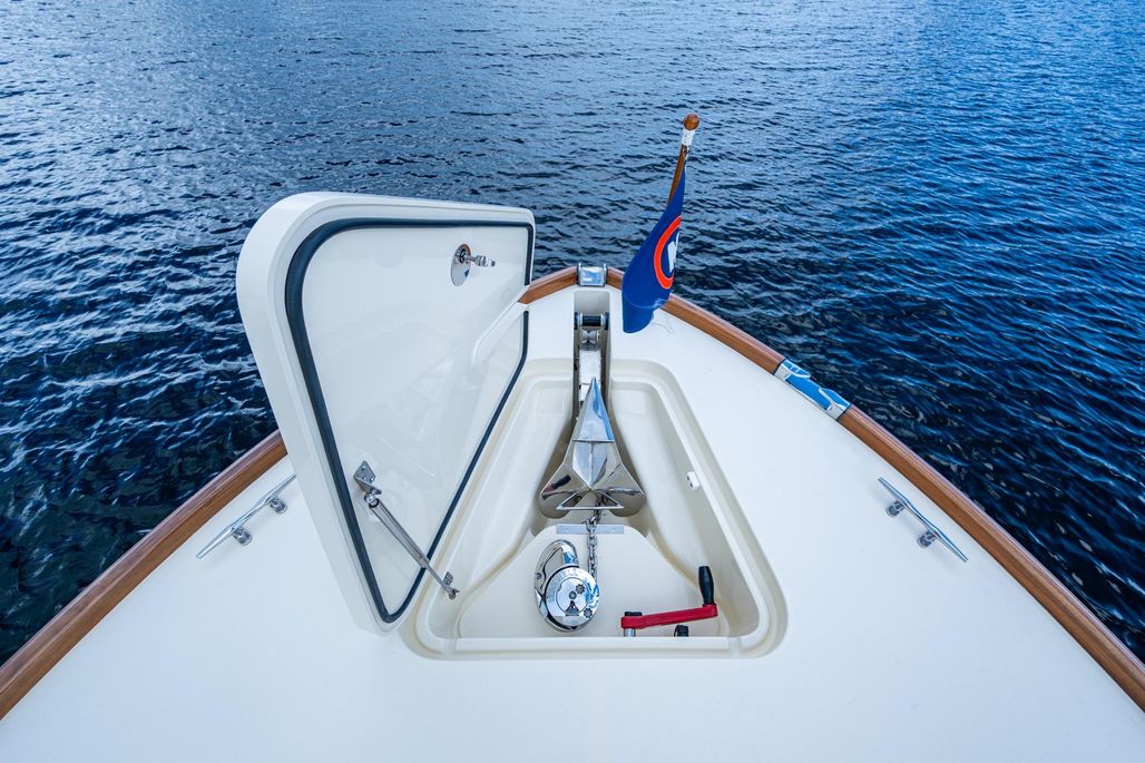 - Flush foredeck anchor locker with hinged hatch and fold-out anchor roller. Hinckley designed polished SS folding anchor roller with 12-volt windlass. Windlass controls at helm and handheld wireless remote. Polished SS Delta anchor with 25’ SS chain and 150’ rode.