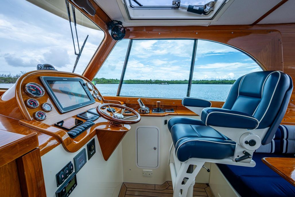 The Pilothouse is fully air condition and features Luxor leather Dune cushions and helm chairs.