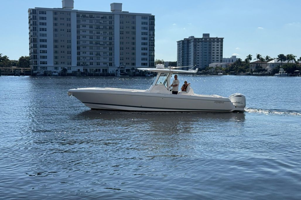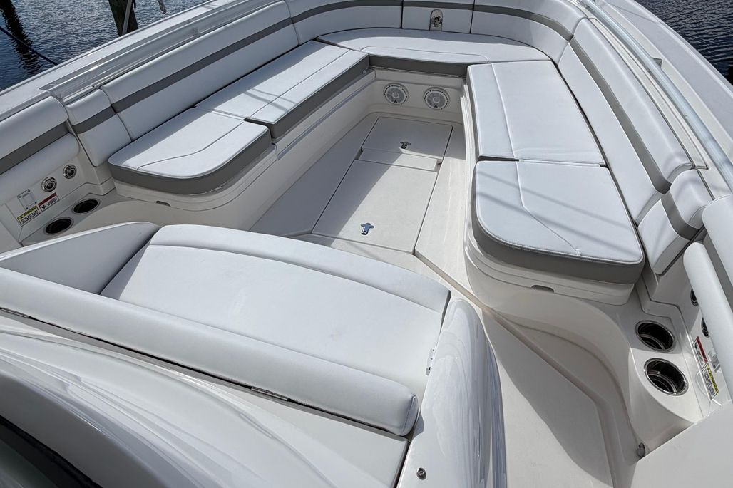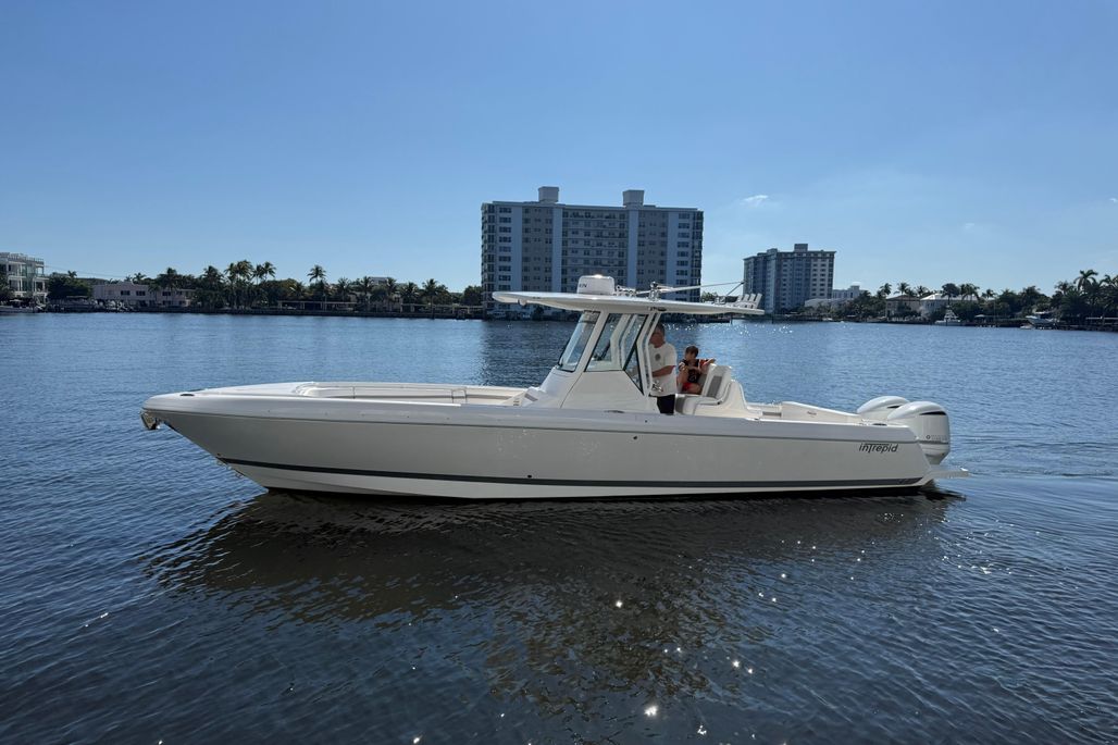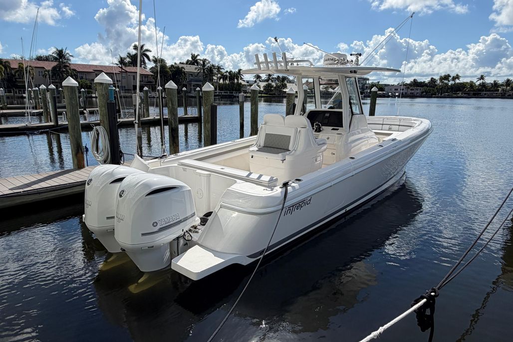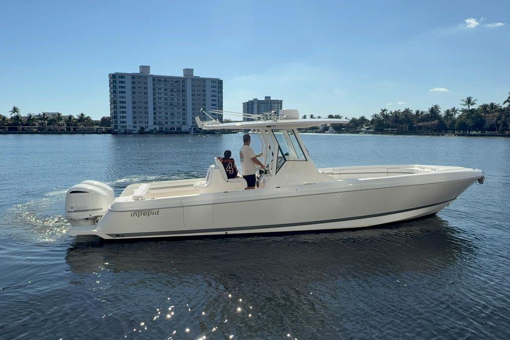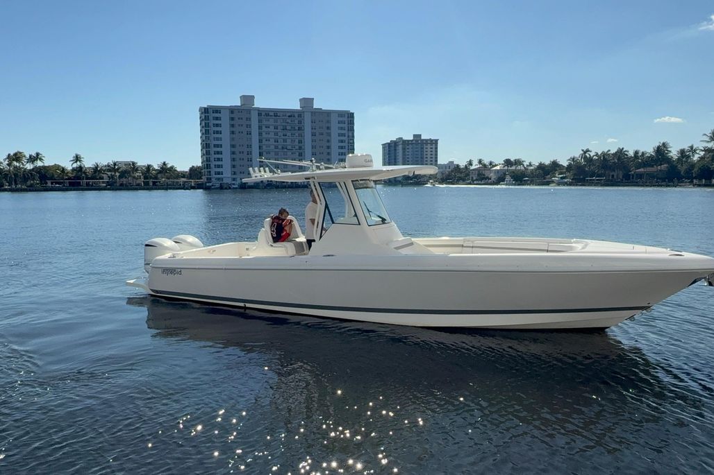 Expansive freeboard tops stylish new sheer and tumblehome transom lines. Signature Intrepid comforts include a spacious head and changing room hidden in the console, plush wraparound forward seating with electric backrests, and integrated or removable rear bench seating.