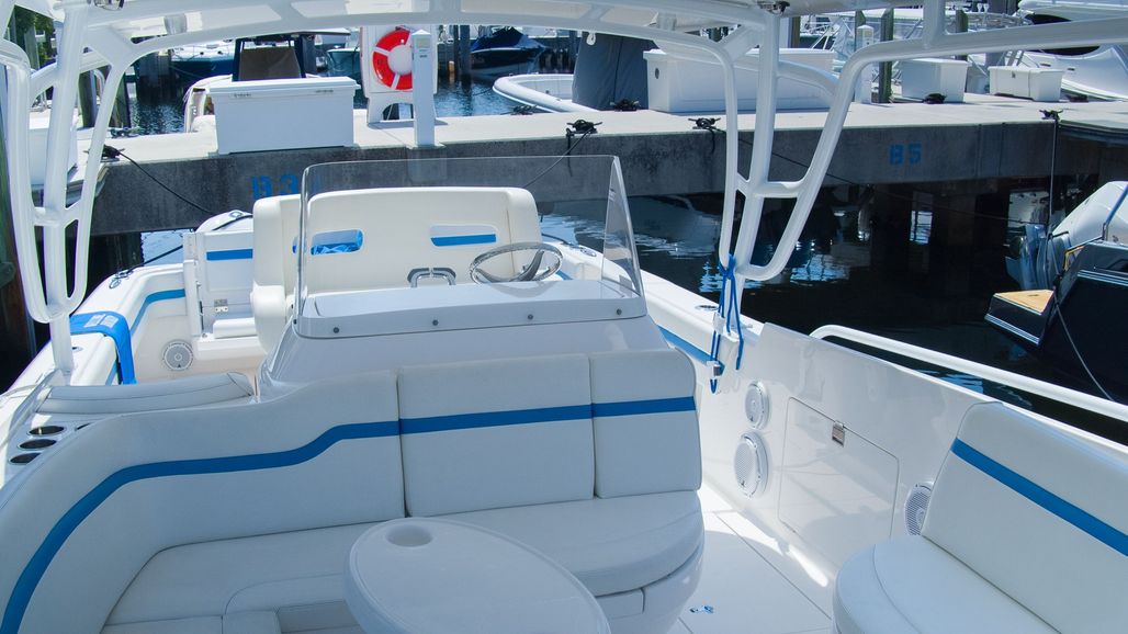 The boat features a versatile cuddy cabin that provides comfortable overnight accommodations, ample storage, and a welcome escape from the elements—perfect for extended day trips, island hopping, or weekends on the water. The layout is equally well-suited for serious offshore fishing, cruising, or entertaining, with wide walkways, secure seating, and a clean, functional helm.