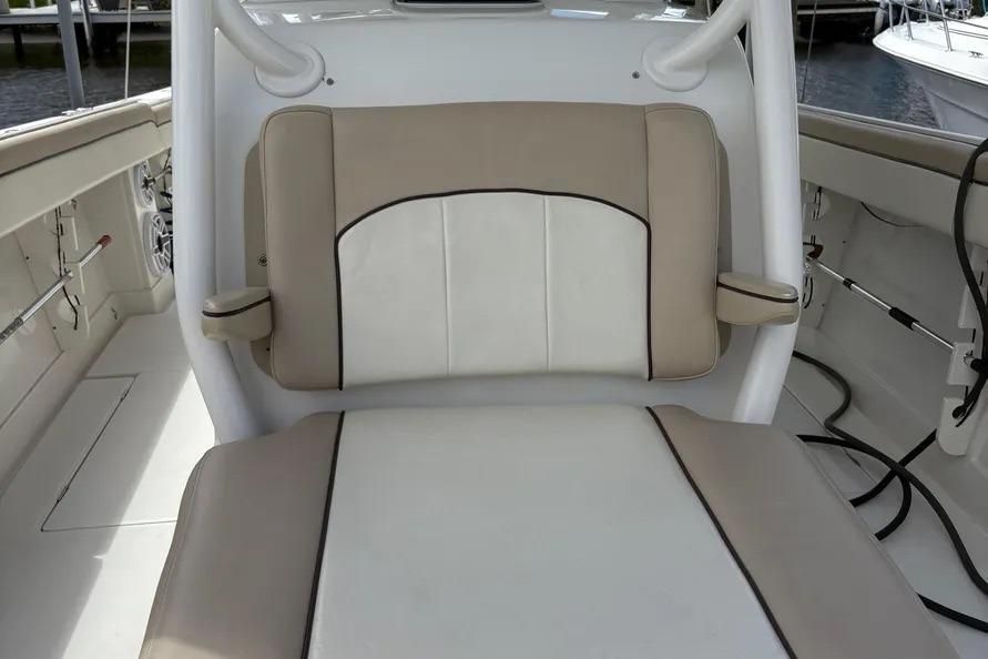 At the helm, twin Garmin displays (16″ below/7″ above) drive the autopilot and night-vision for confident navigation day or night. A new bow thruster (2023) pairs with precise throttles for easy docking, and the 2,000-watt Fusion/JL system keeps the crew energized between stops. With triple Yamaha 300s, a 485-gal fuel capacity and Jupiter’s proven deep-V, you’ll cruise efficiently in the low-30-knot range and still have punch to chase the bite.