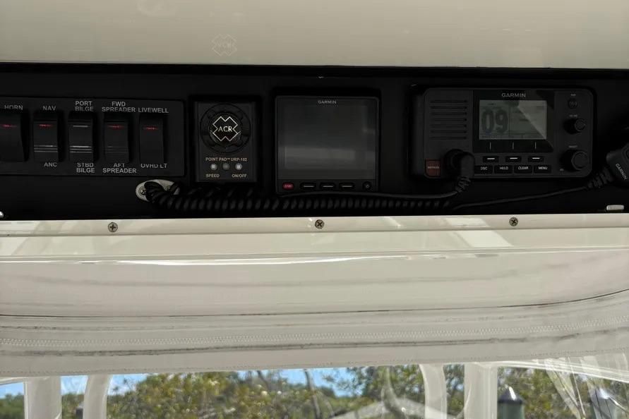 Garmin 16″ MFD at main helm · 7″ display at tower · Garmin autopilot (auto-helm feature) · night-vision · Fusion stereo (2,000 W) with 10 JL speakers