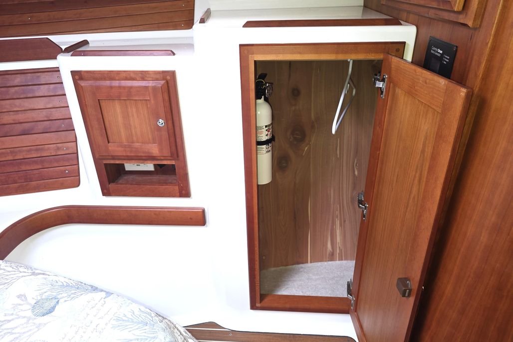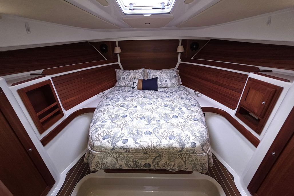 Her single-level deck from transom to companionway bring the social spaces of the cockpit and pilothouse into one, offering a beautiful and seamless transition between indoors and out. A galley-up design opposite a versatile settee and open sightlines all the way around the boat make the upper level of the Back Cove 32 ideal for entertaining or relaxing. Below, the cruising couple can enjoy a secluded oasis all their own. Featuring a spacious island berth and split head and shower units, her practical and elegant details offer unprecedented comfort when spending time on board.