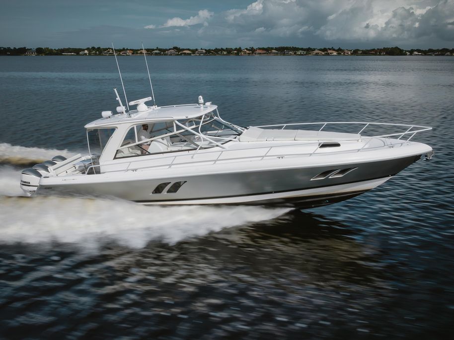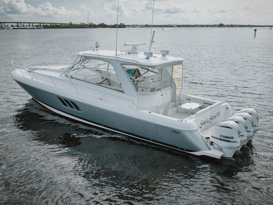 Turn heads and experience luxury performance with this 2018 Intrepid 475 Sport Yacht, equipped with quad 350hp Yamahas for a smooth and exhilarating 40mph cruise. Designed for both adventure and comfort, this yacht offers spacious dual staterooms, convertible seating for up to six overnight guests, and a 6’4” headroom in the head with a separate stall shower.