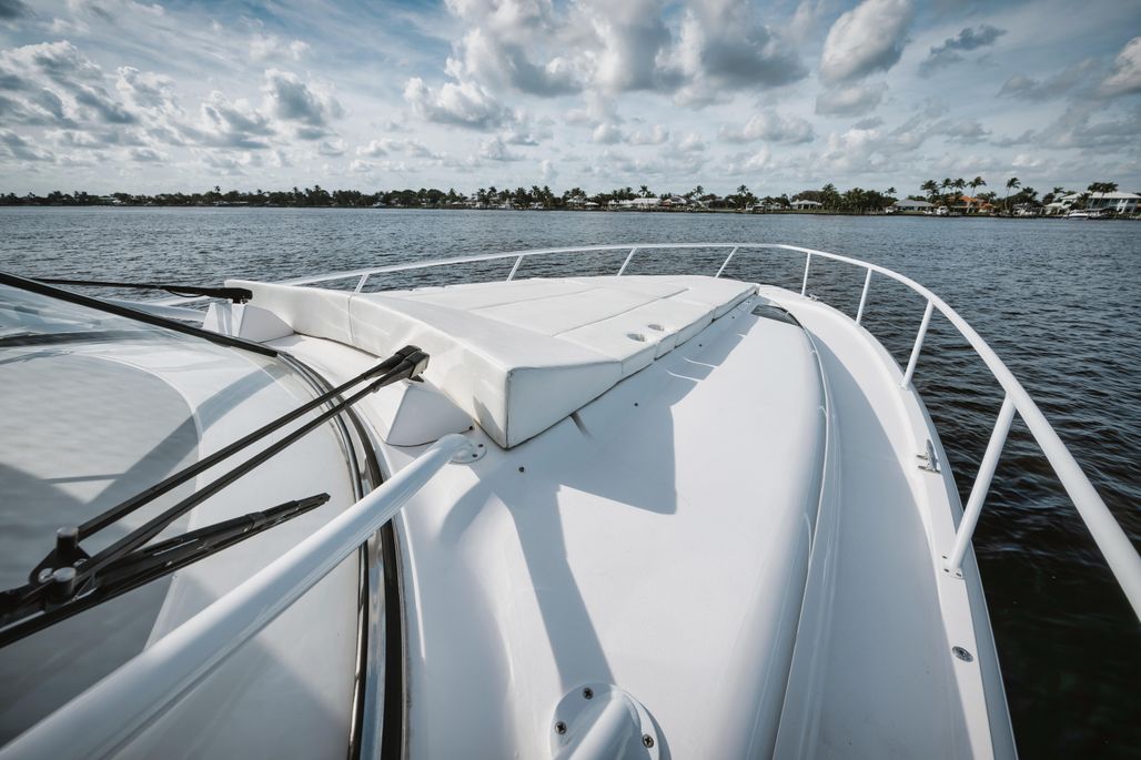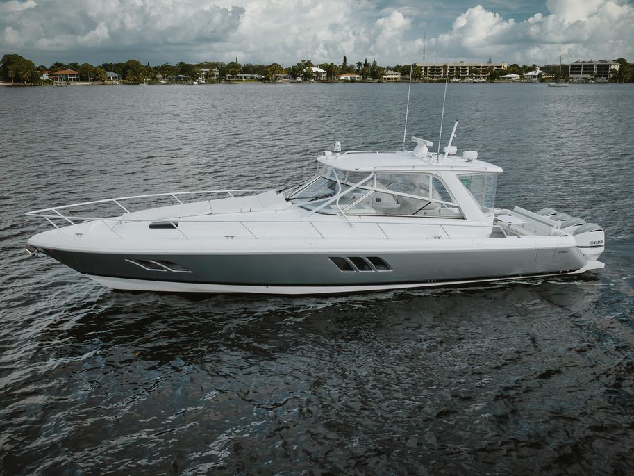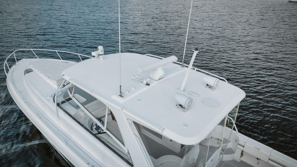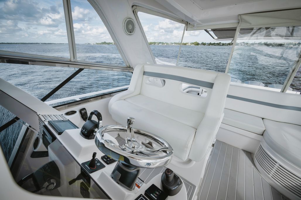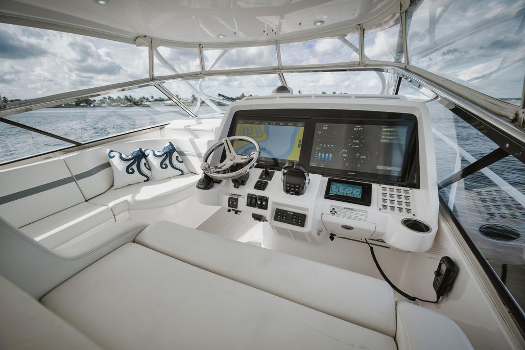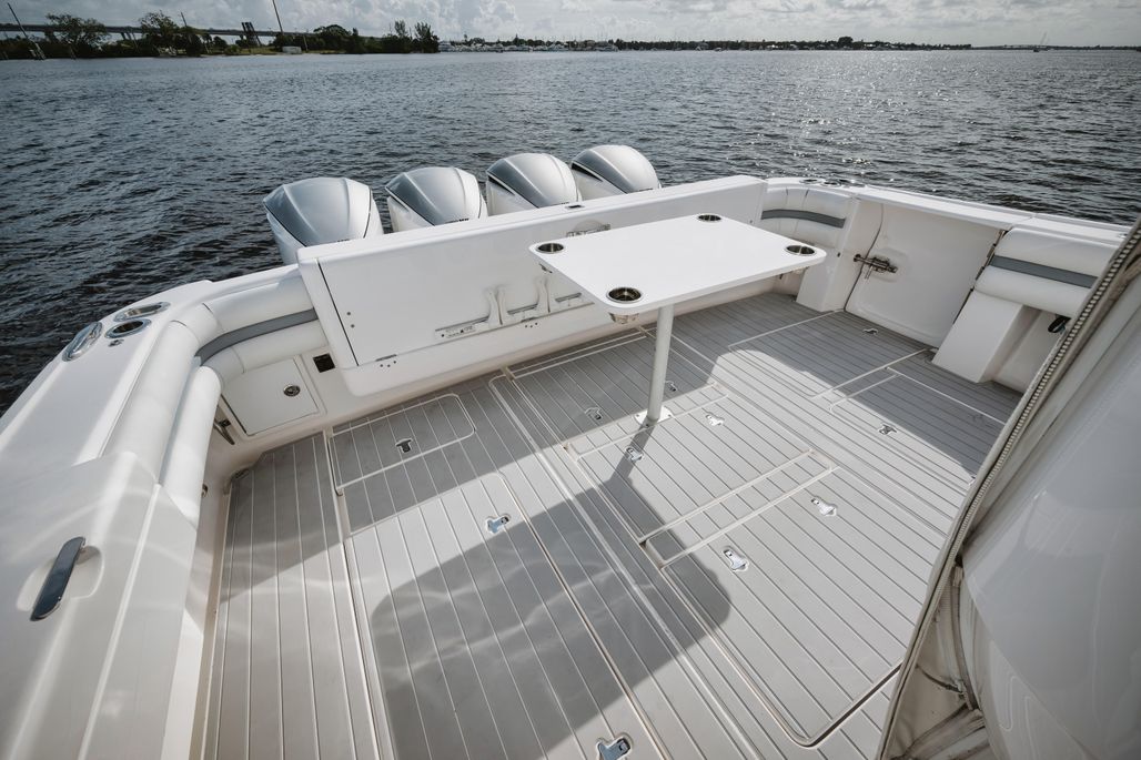 Enhanced by premium features such as a Seakeeper 5, upgraded Westerbeke genset, DekIt sole, Isinglass enclosure, electric cockpit sunshade, Pompanette electric helm seat, bow thruster, dive door, flip-down transom seat, sun pad, underwater lights, and more.