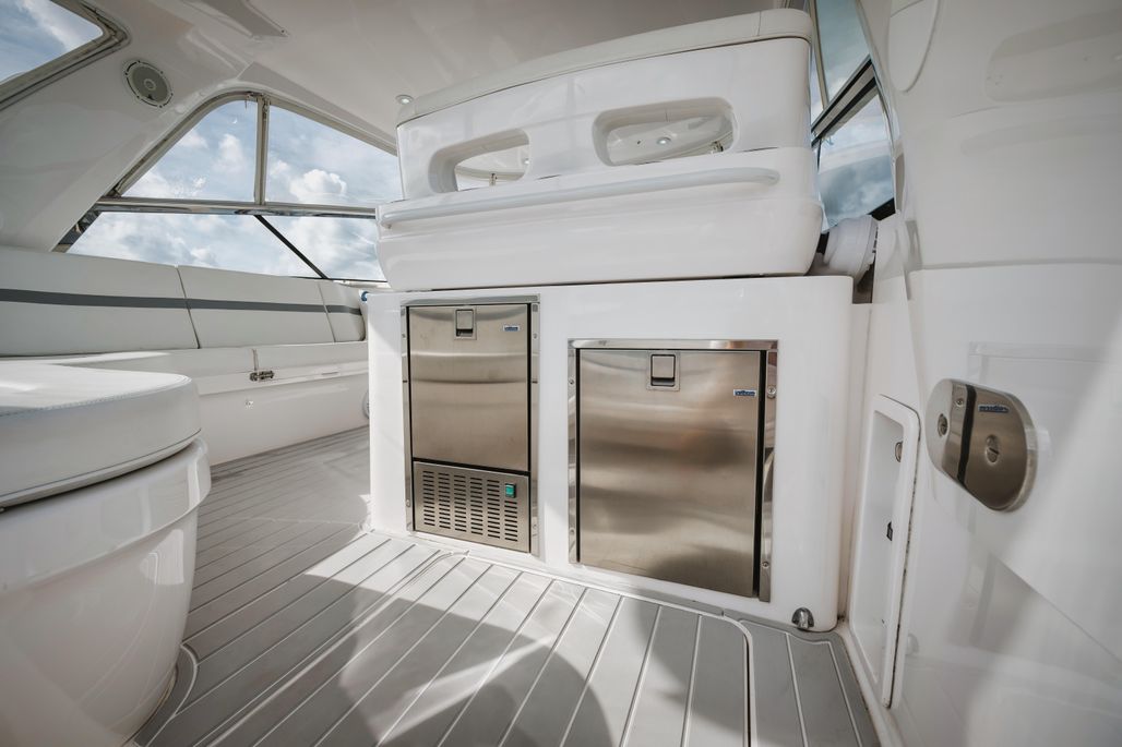 The helm is fully outfitted with top-tier electronics, including Garmin, Fusion, FLIR, and Yamaha, all complemented by helm air conditioning for ultimate comfort. 100 sq. ft. of open cockpit provides ample space for fishing, diving, or sunbathing.